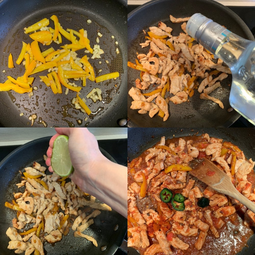 Tagliate la cipolla e il peperone a striscioline e fateli soffriggere, aggiungete successivamente il pollo e il manzo tagliati allo stesso modo; quando la carne sarà ben rosolata sfumare con un po’ di tequila, il succo del lime e mezzo bicchiere d’acqua.