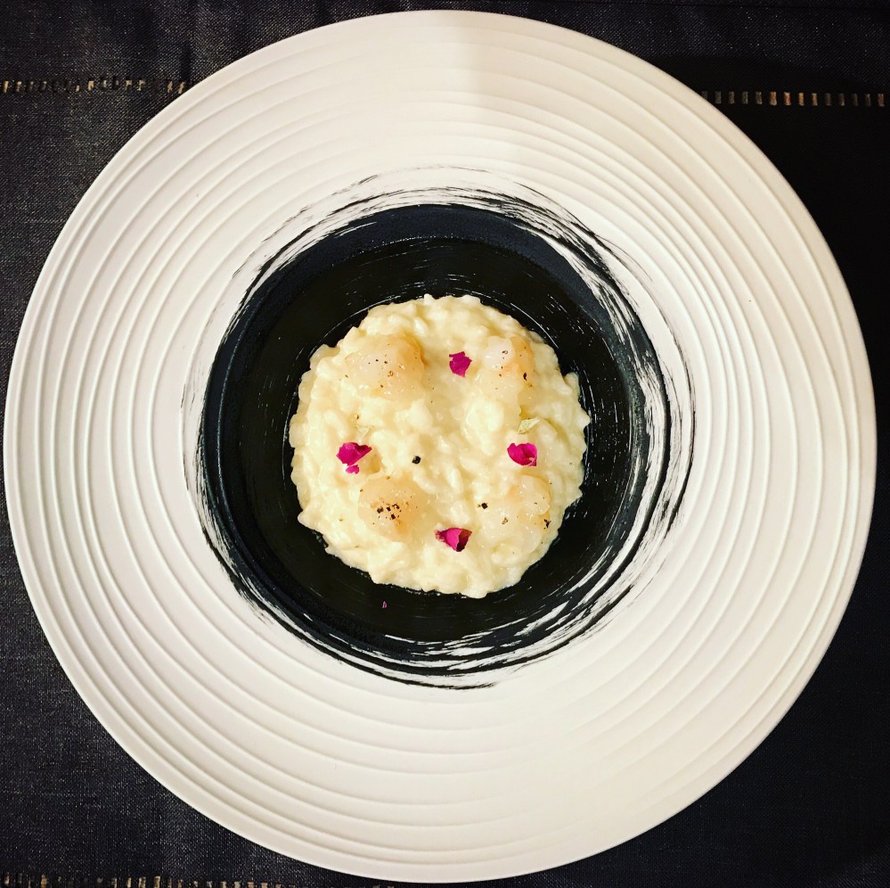 Impiattate adagiando sul risotto dei ciuffetti di Tartare di scampi e servite in tavola accompagnando il tutto con il restante Champagne!