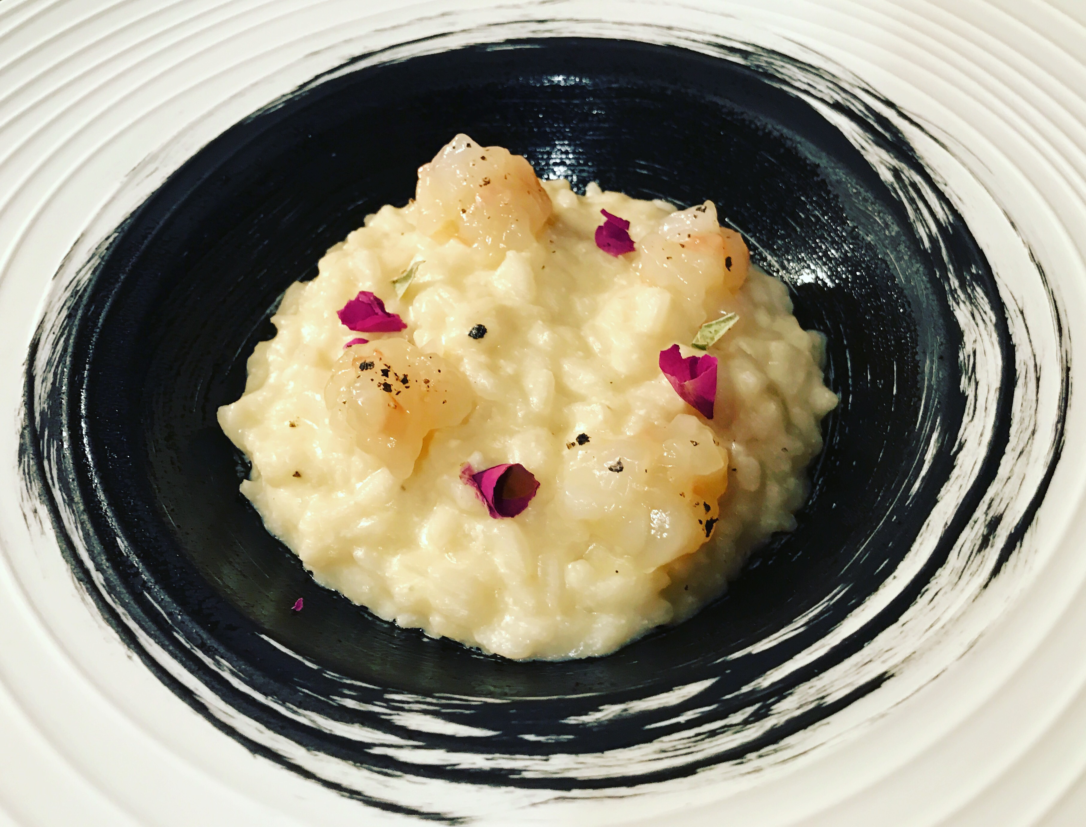 Impiattate adagiando sul risotto dei ciuffetti di Tartare di scampi e servite in tavola accompagnando il tutto con il restante Champagne!