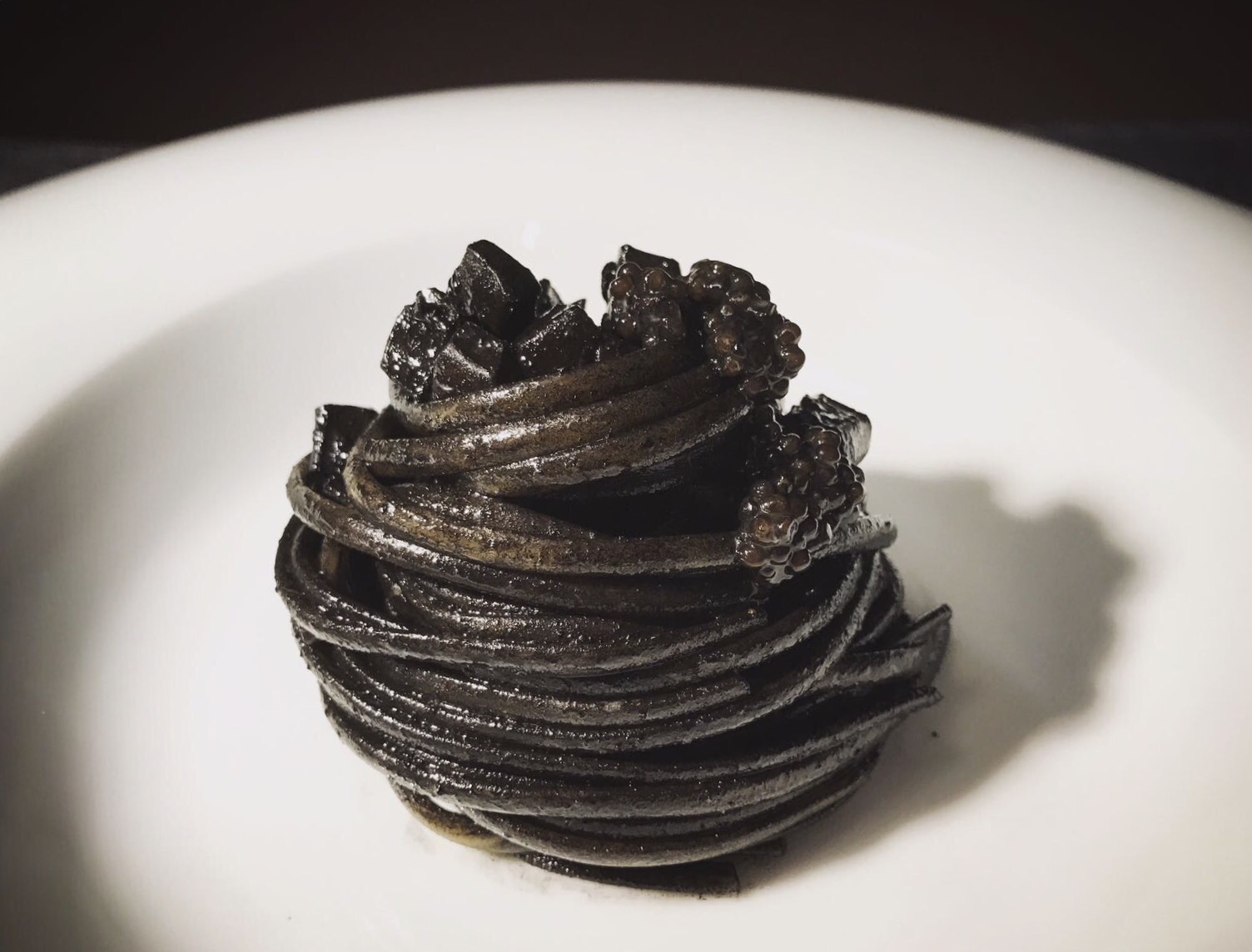 Impiattate le linguine formando un nido aiutandovi con il mestolo e una pinza; aggiungete i pezzettini di seppia che restano in padella e guarnite con del caviale.