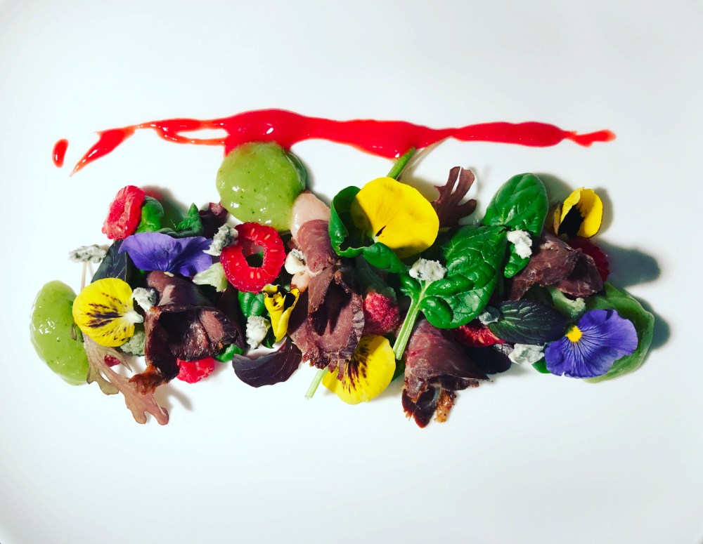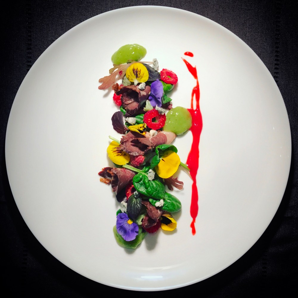 Impiattate posizionando prima le foglie di spinacino e misticanza varia, arrotolate le fettine di petto d’anatra e disponetele qua e là tra le foglie di insalata, aggiungete le fettine di lamponi, lo zola sminuzzato e adagiate le due salse.