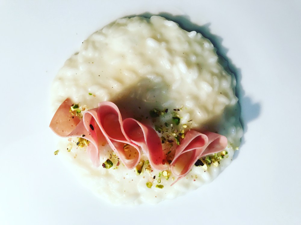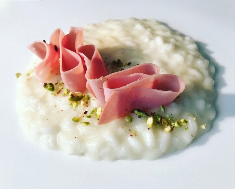 Impiattate il risotto e guarnite con un paio di strichioline ricavate da una fetta di mortadella e della granella di pistacchi!
