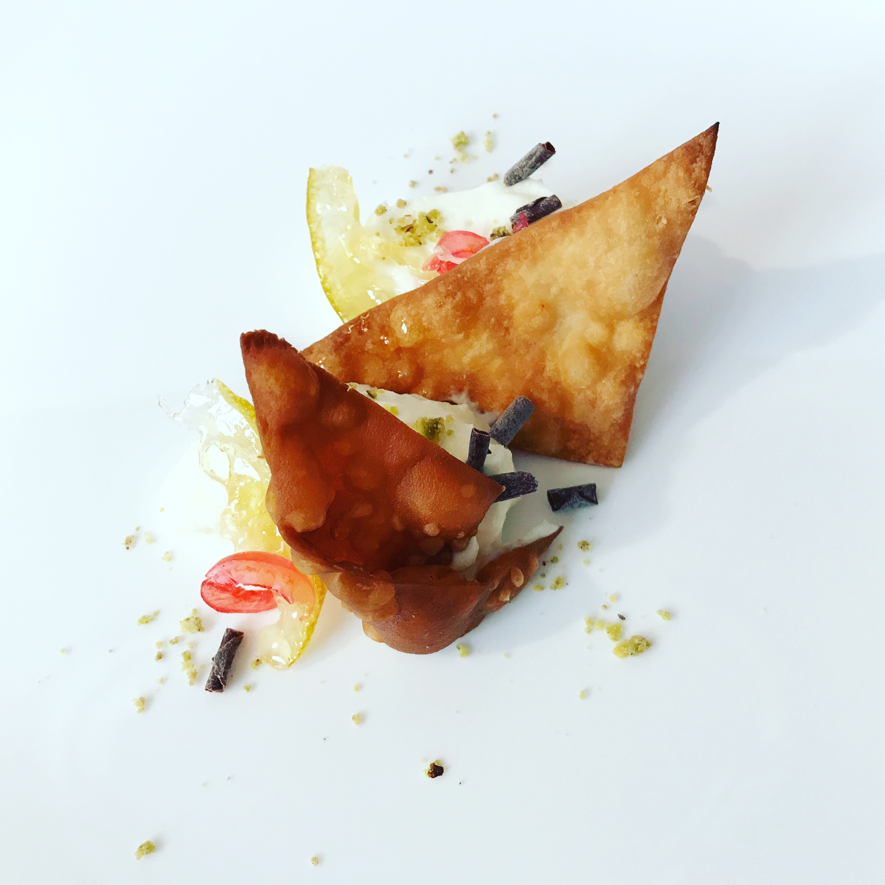 Per l’impiattamento gourmet tagliate la pasta a triangolini e friggetela; mettete un paio di quenelle di ricotta sul piatto e adagiate la cialdina e decorate con dei riccioli di cioccolato e la frutta candita.
