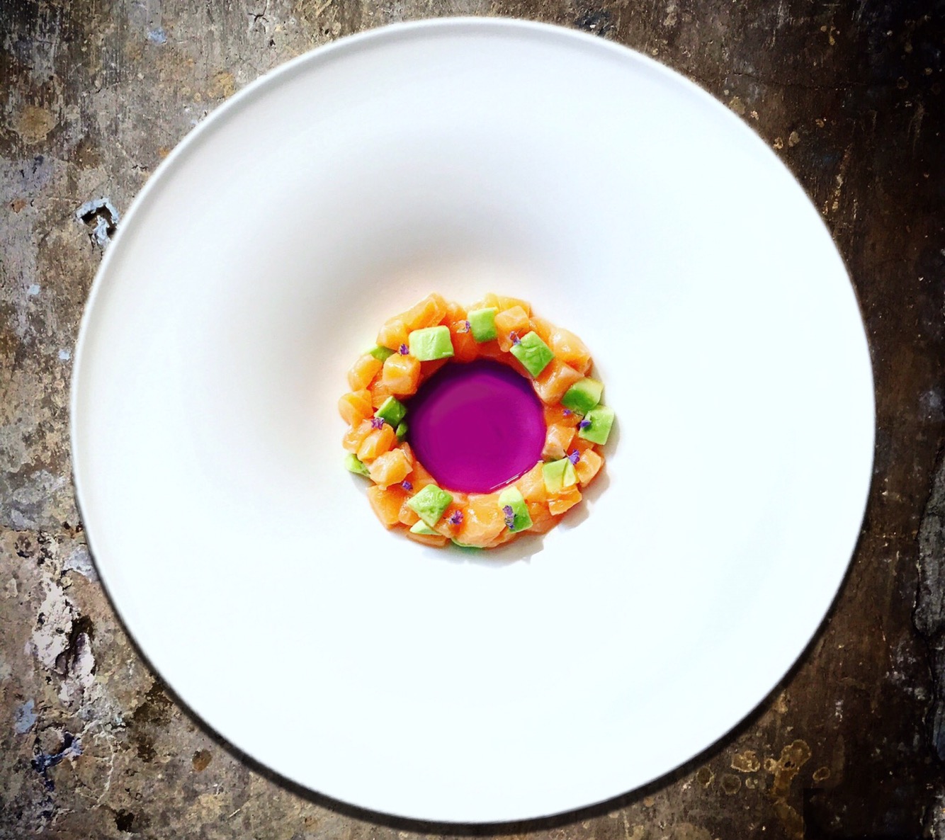 Posizionate un coppapasta al centro del piatto e all’esterno di esso adagiate delle cucchiaiate di tartare e avocado formando un cerchio. Eliminate lentamente il coppapasta e versate all’interno l’estratto di cavolo filtrato.