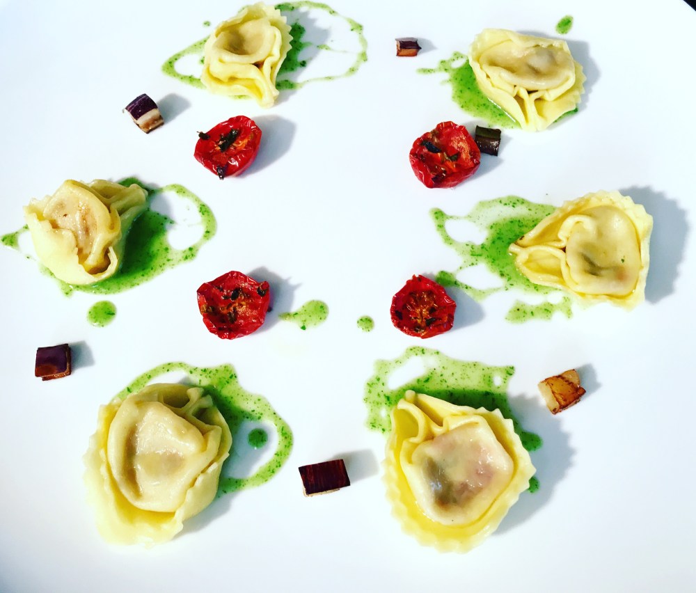 Adagiate i tortelli e aggiungete le melanzane e i pomodorini confit.