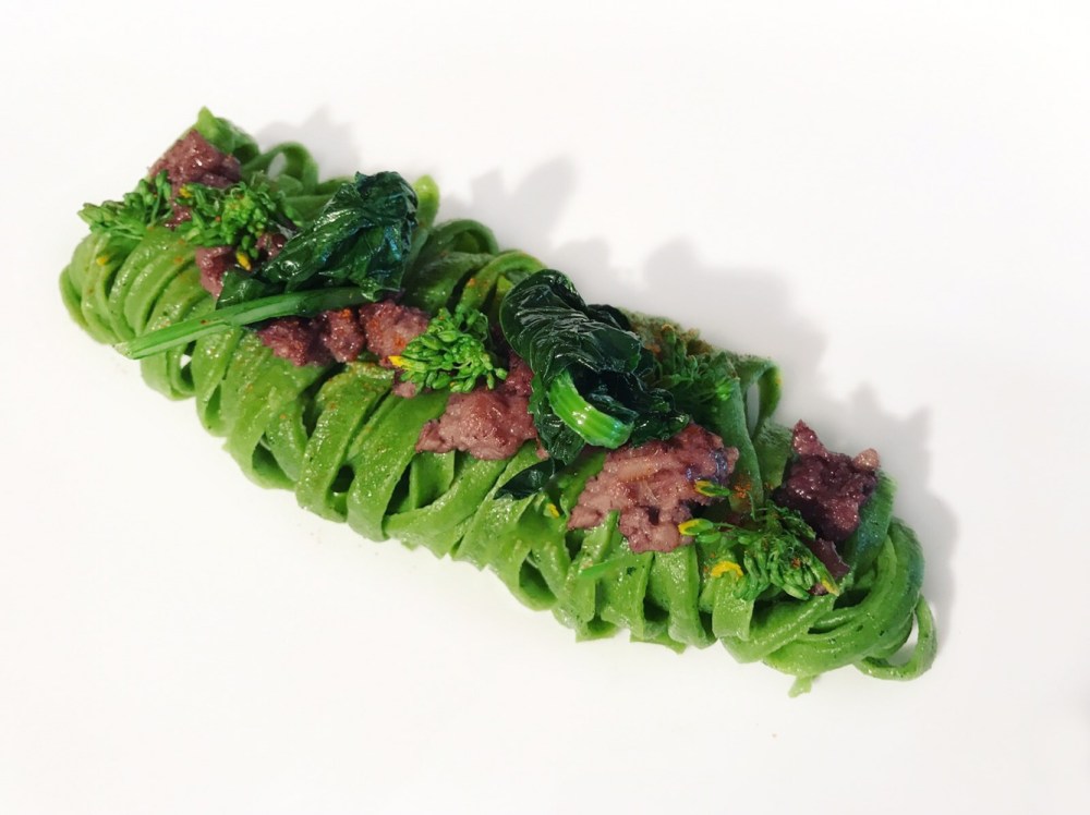 Fettuccine, rigorosamente tirate e matterello e tagliate a coltello, salsiccia e friarielli (cime di rapa soffritte in padella con l’aglio)