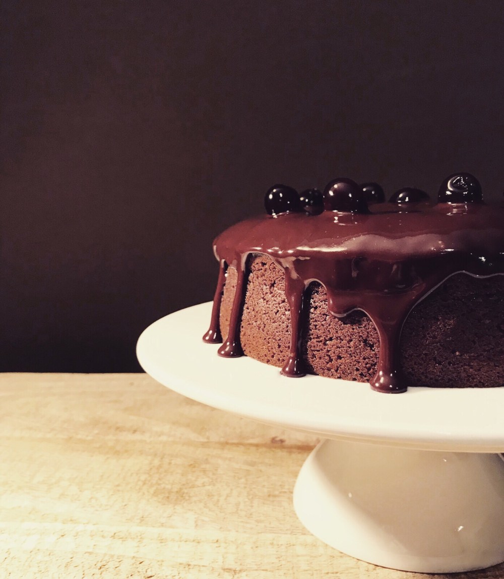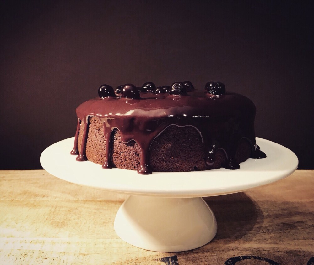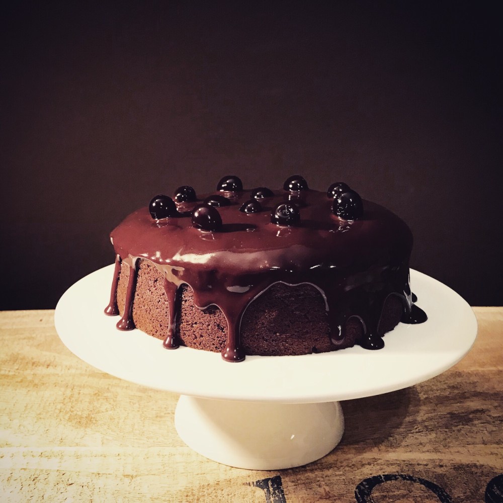 Con un pennello bagnate la superficie della torta con dello Cherry e coprite con la ganache al cioccolato.