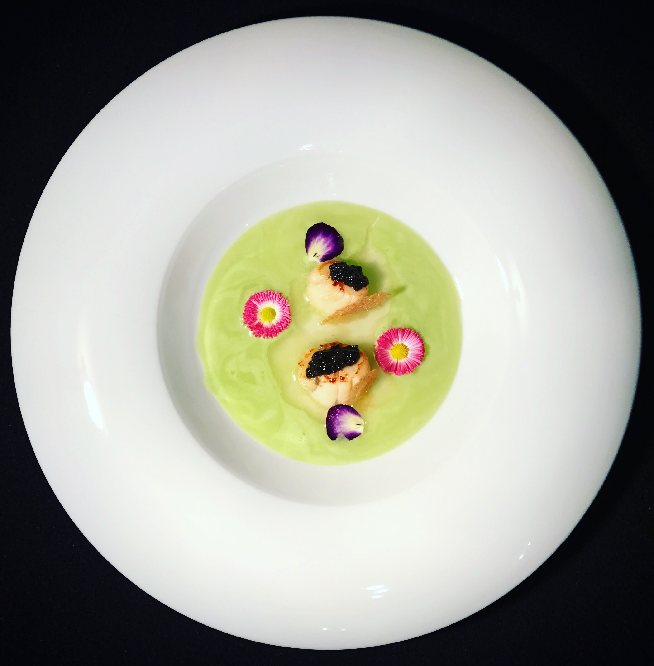 Impiattate posizionando le capesante nel piatto, versate l’acqua di sedano e mela e, per un gusto più deciso, adagiate 1/2 cucchiaino di caviale su ogni capasanta.