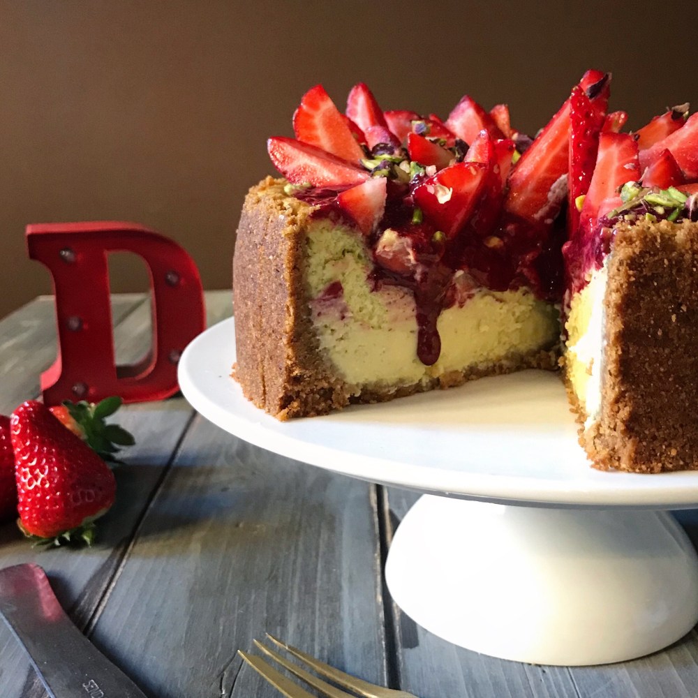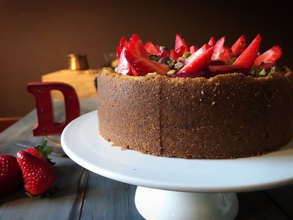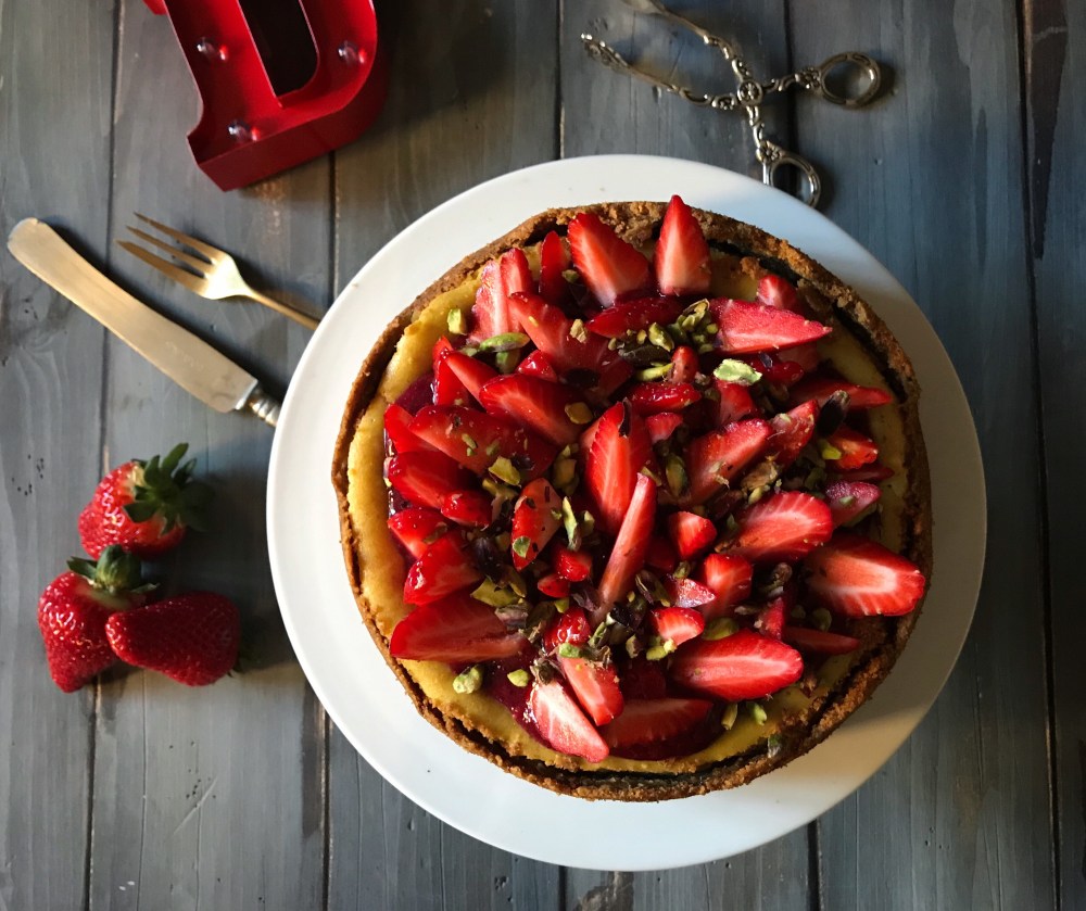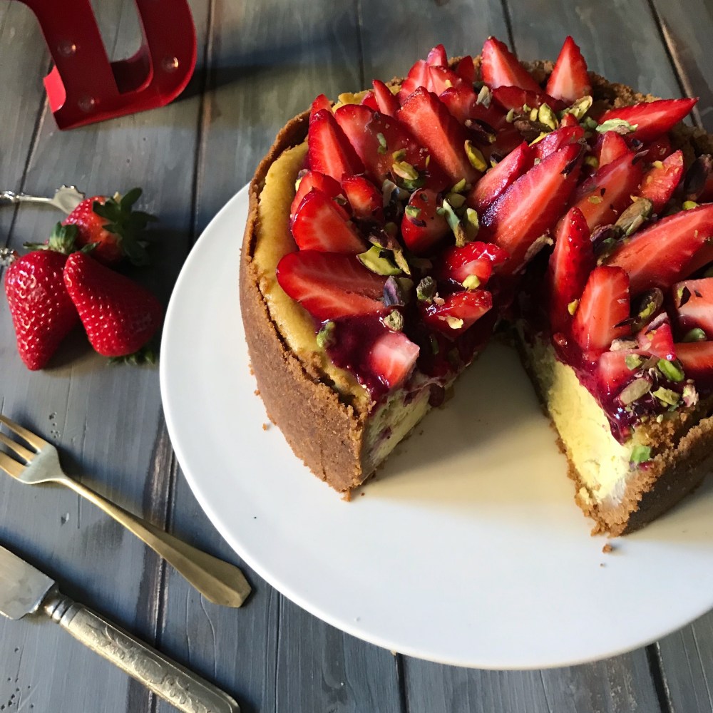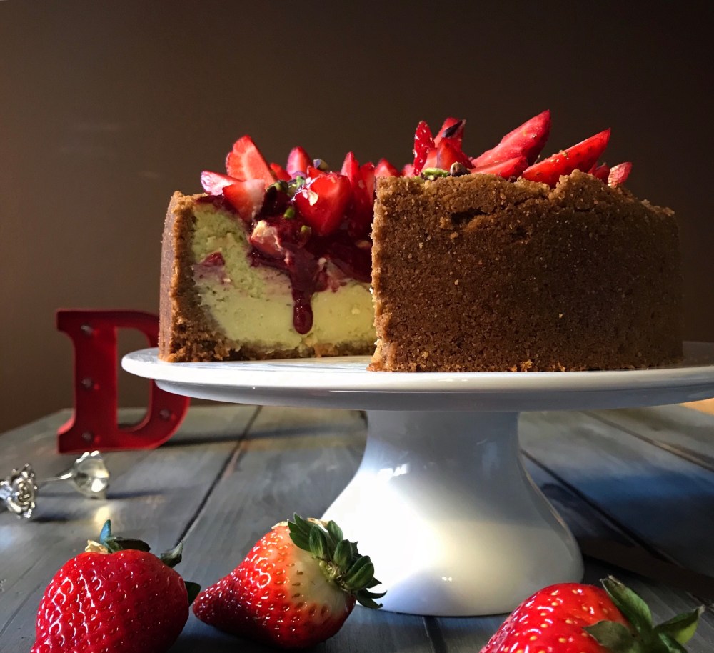 Versate la salsa sulla torta e lasciate riposare in frigo e guarnite con fragole fresche e granella di pistacchi.