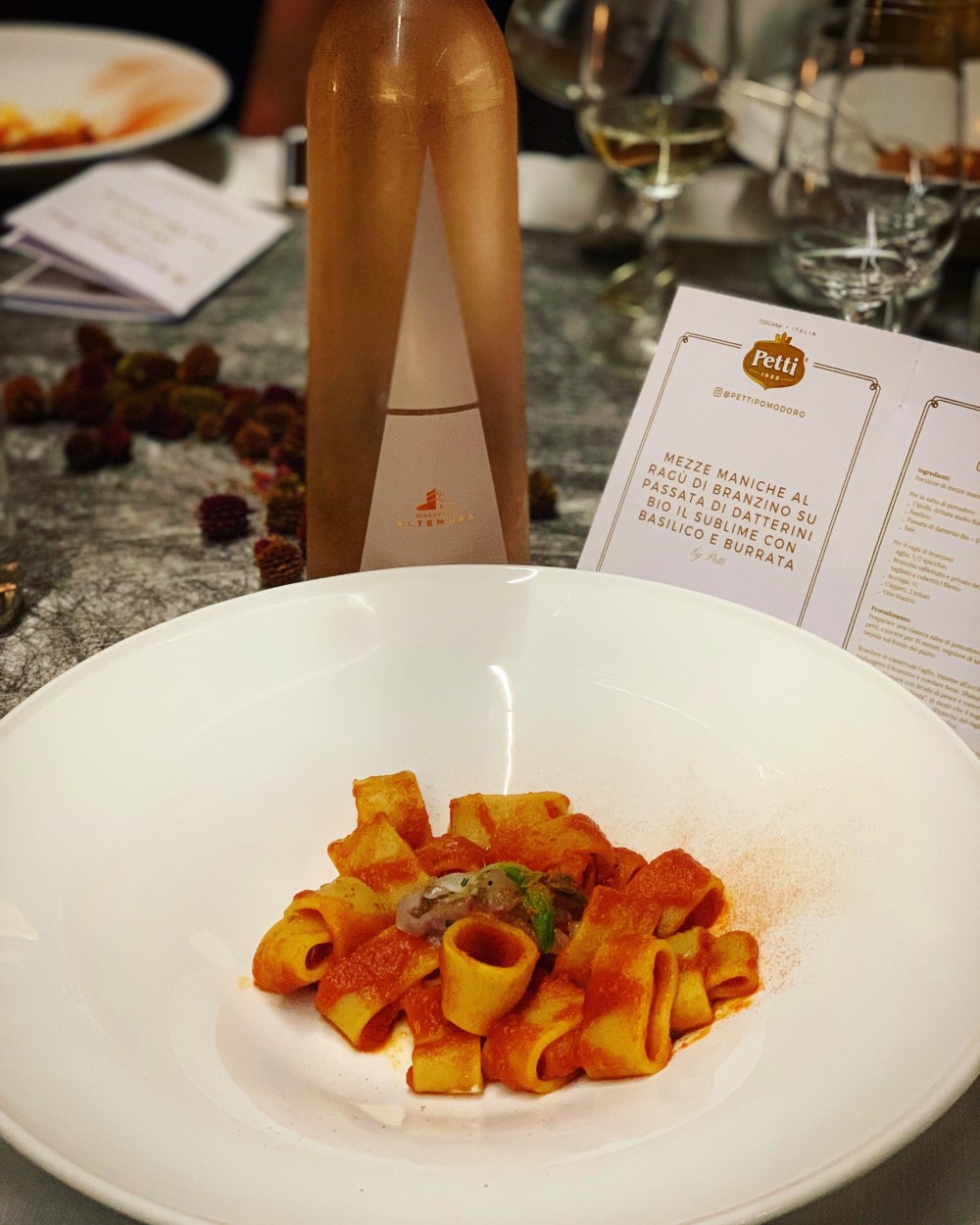 Mezze maniche al ragù di branzino su passata di datterini bio della linea Petti Pomodoro