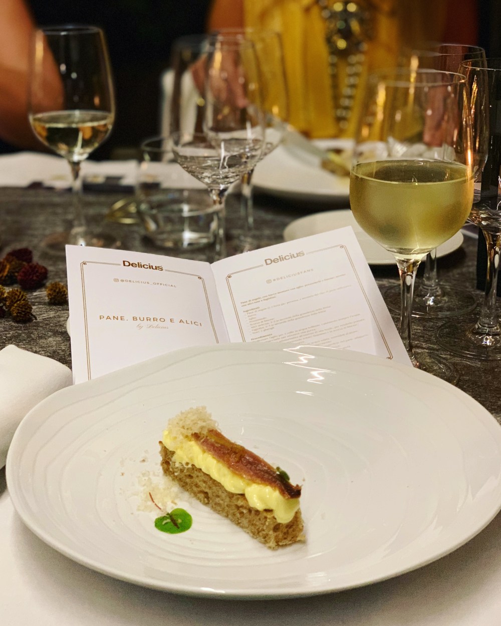 Pane di segale con burro montato all’aglio, limone, Alici tese della linea Delicius abbinato a un Fiano 2018 Masseria Altemura