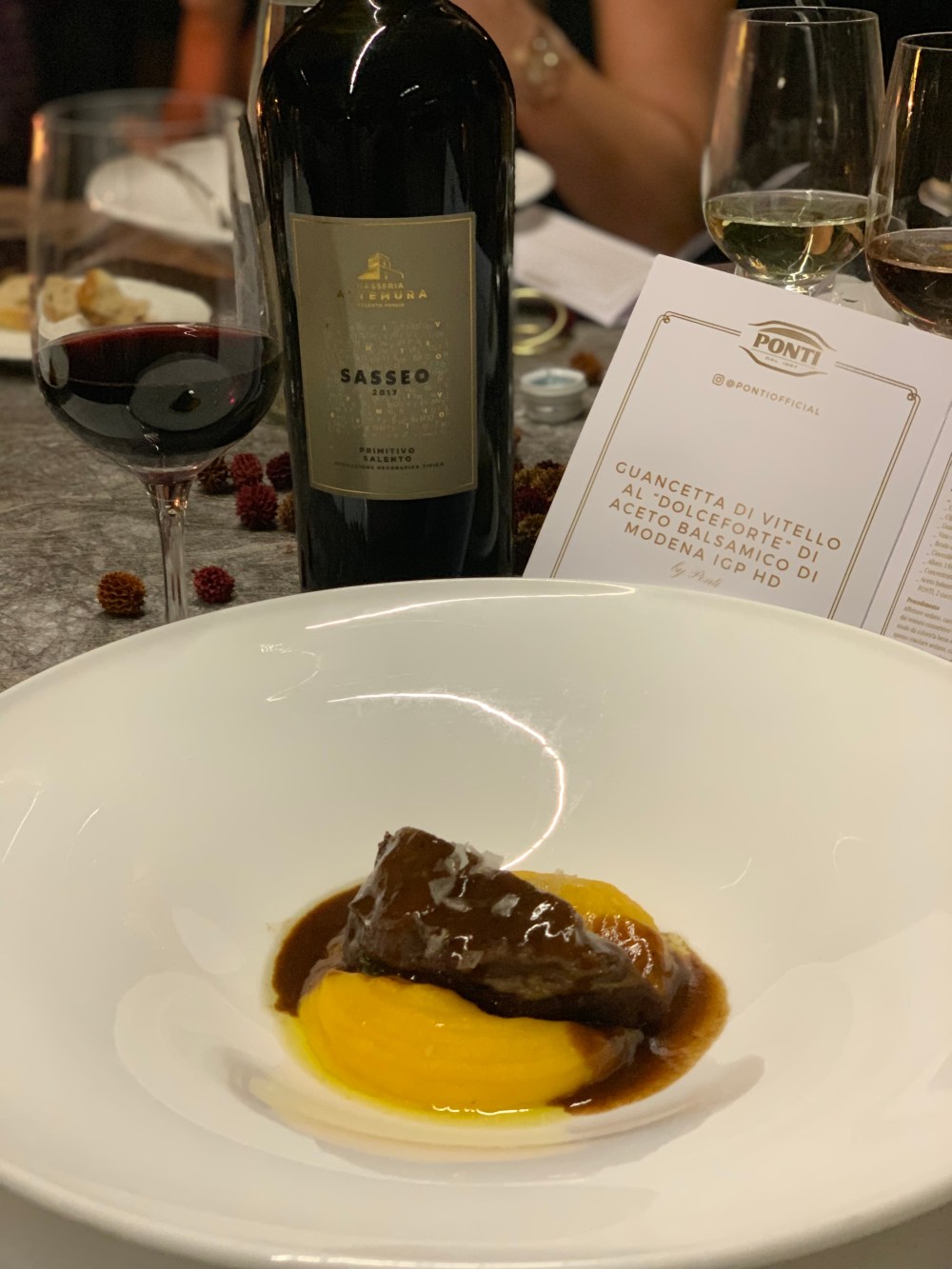 Guancetta di vitello all’aceto di Modena offerto da Ponti , abbinato al Primitivo del Salento, Sasseo, Masseria Altemura