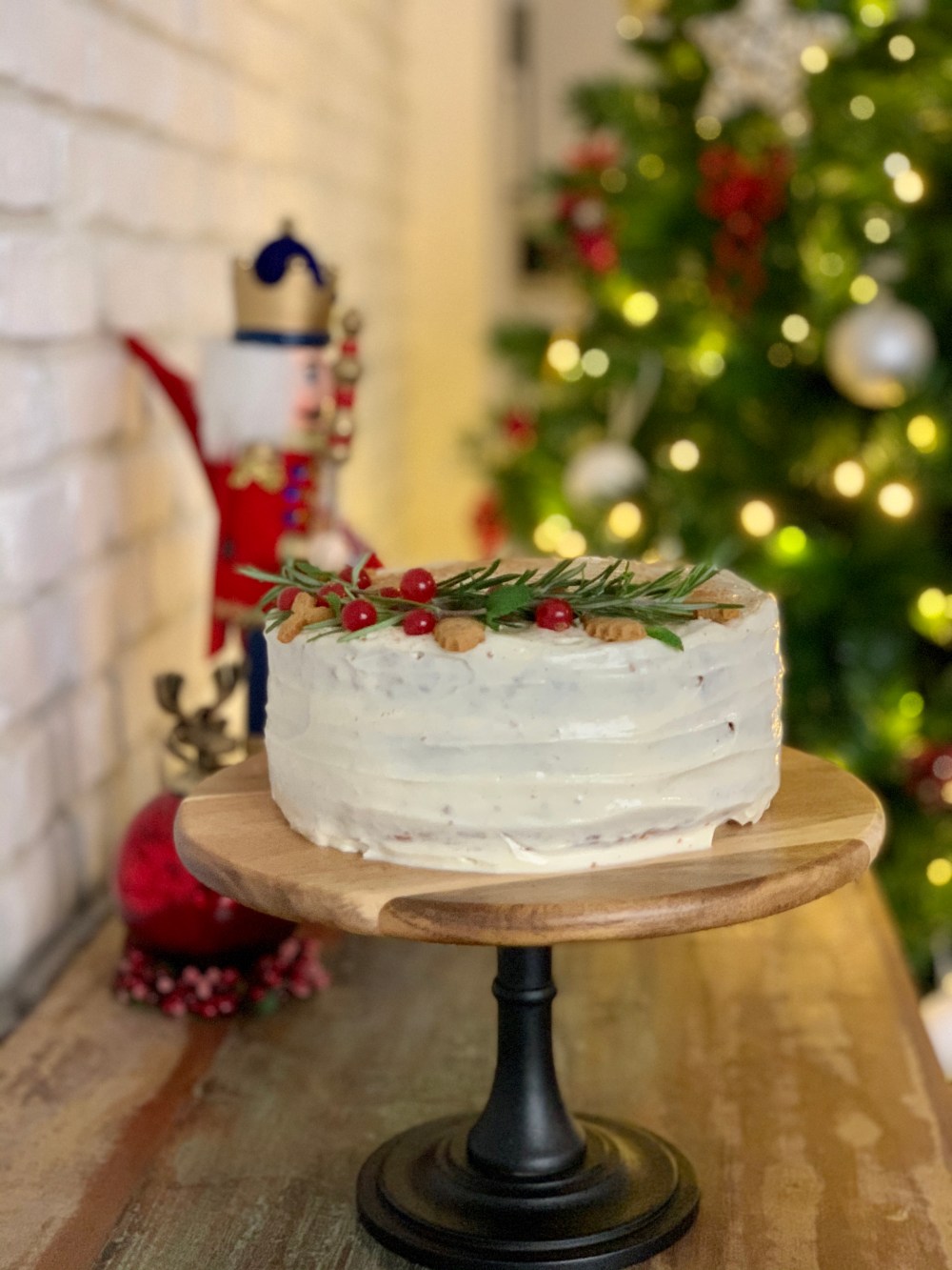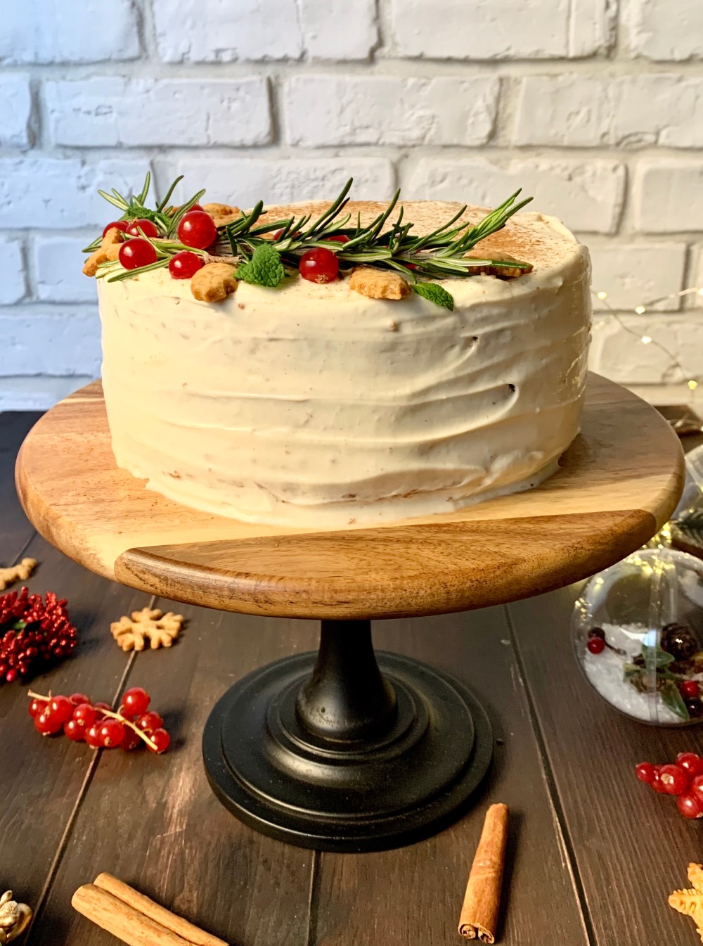 Decorate con altra cannella in polvere, frutti rossi, rosmarino e biscottini natalizi.