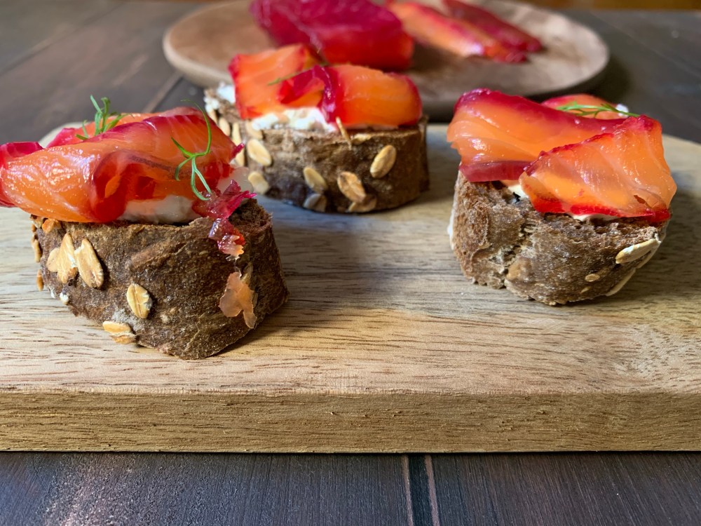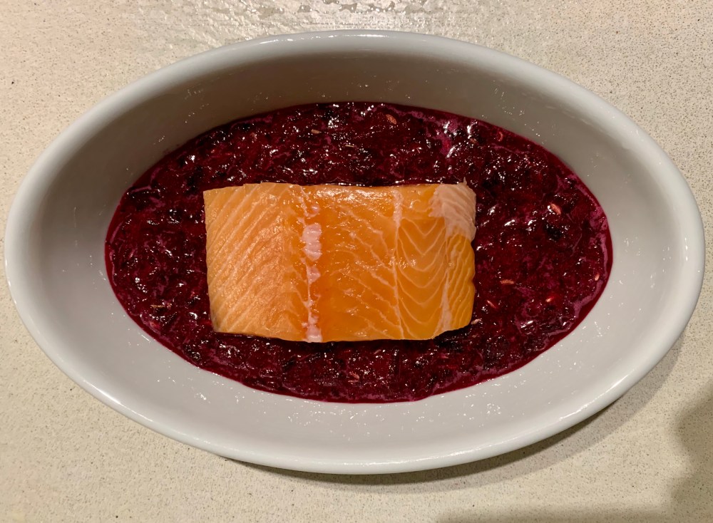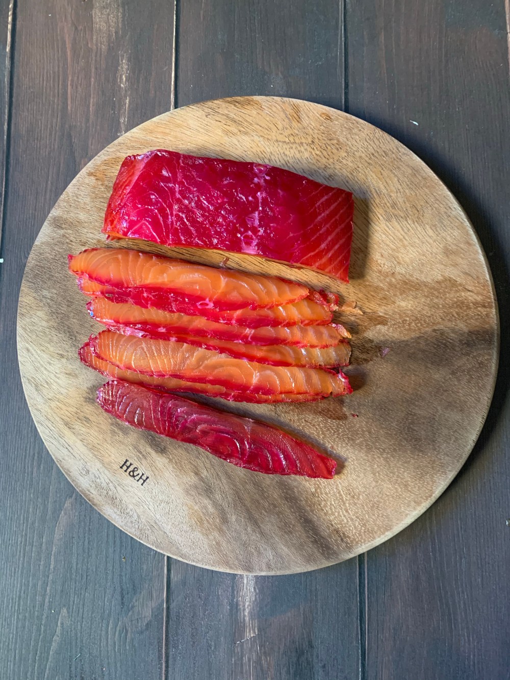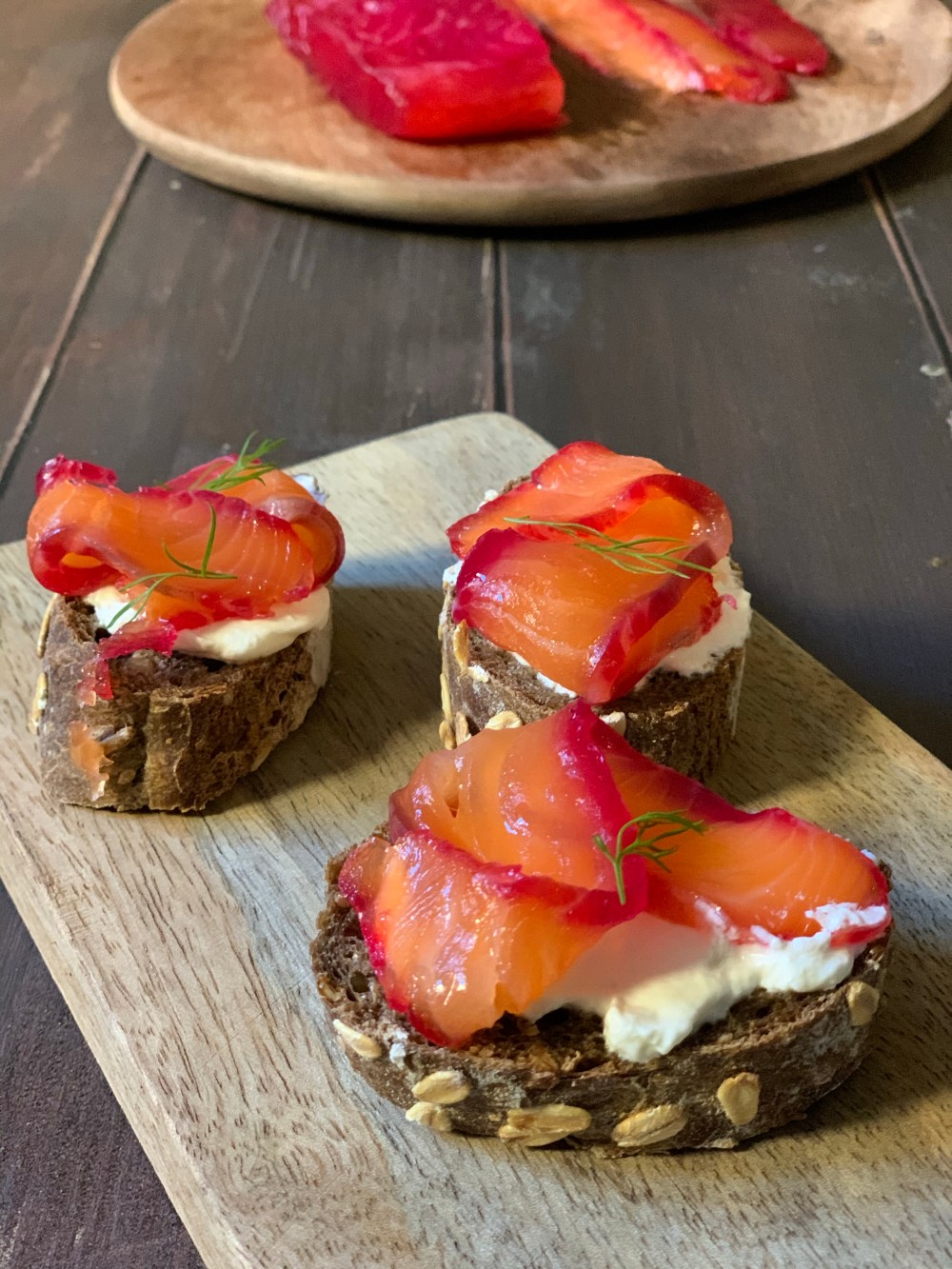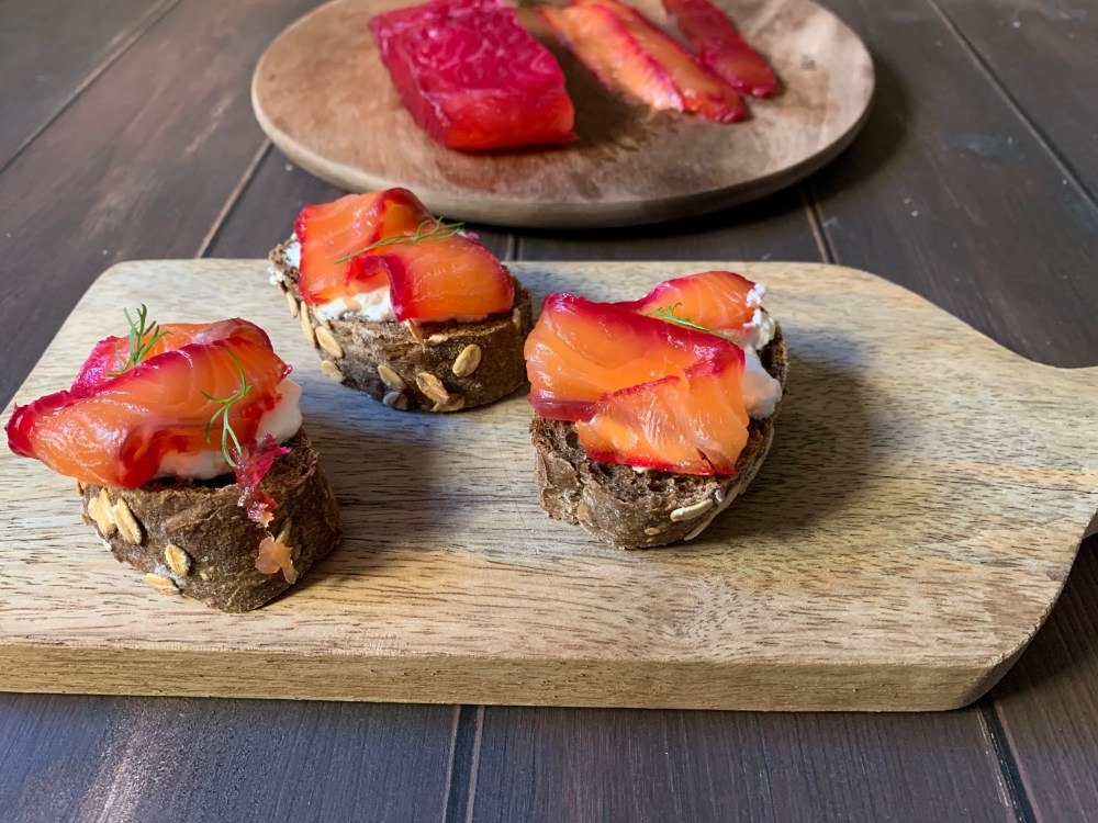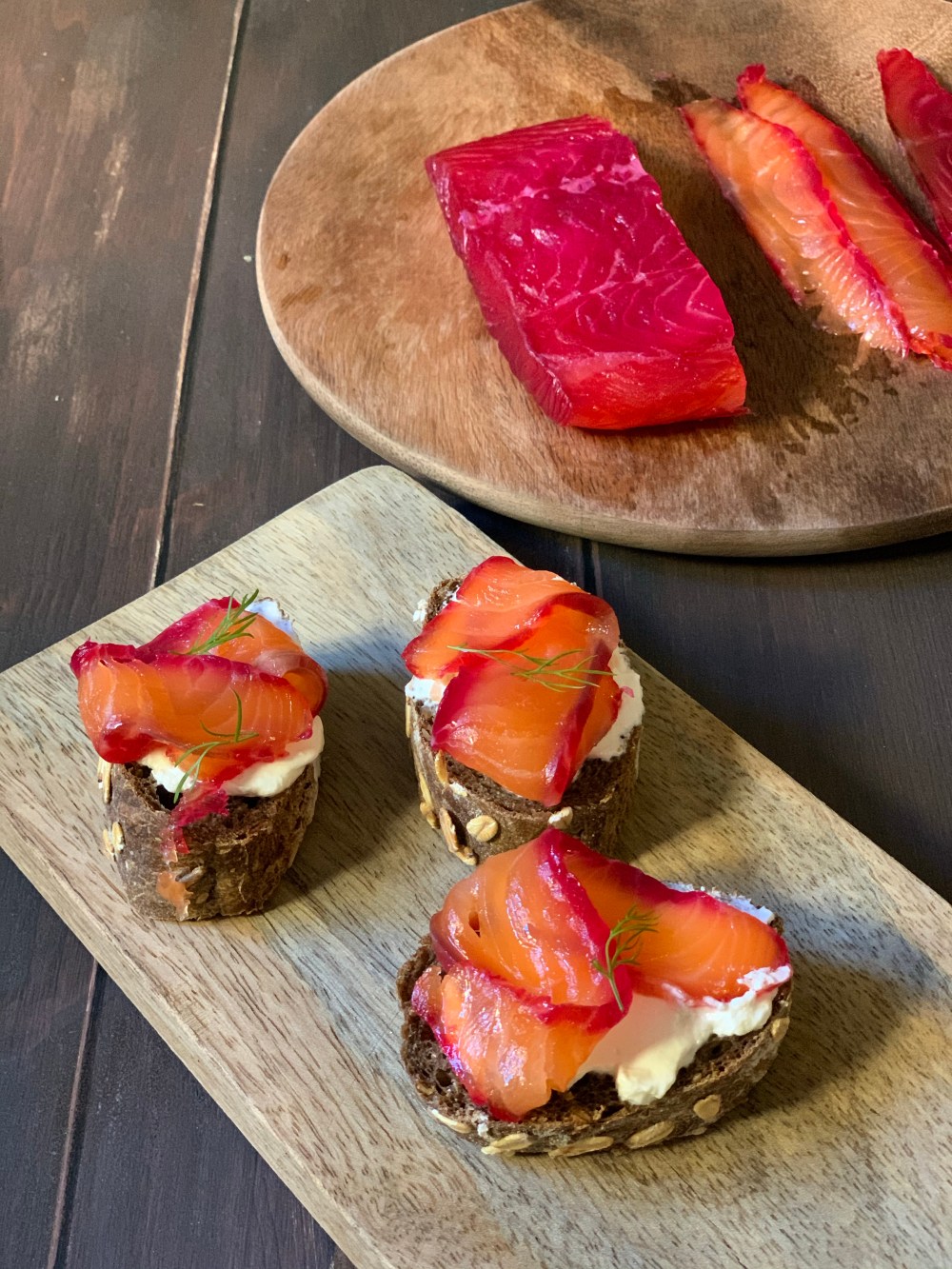 In Svezia questa marinatura si chiama Gravlax, non è altro che una miscela di zucchero, sale e le spezie che preferite. Vedrete che la consistenza del pesce cambierà e diventerà notevolmente più duro, rendendolo simile al salmone affumicato. L’utilizzo della barbabietola fa si che l’esterno del del salmone si colori di un rosso brillante, in contrasto con la polpa che rimarrà dell’arancione naturale del salmone.