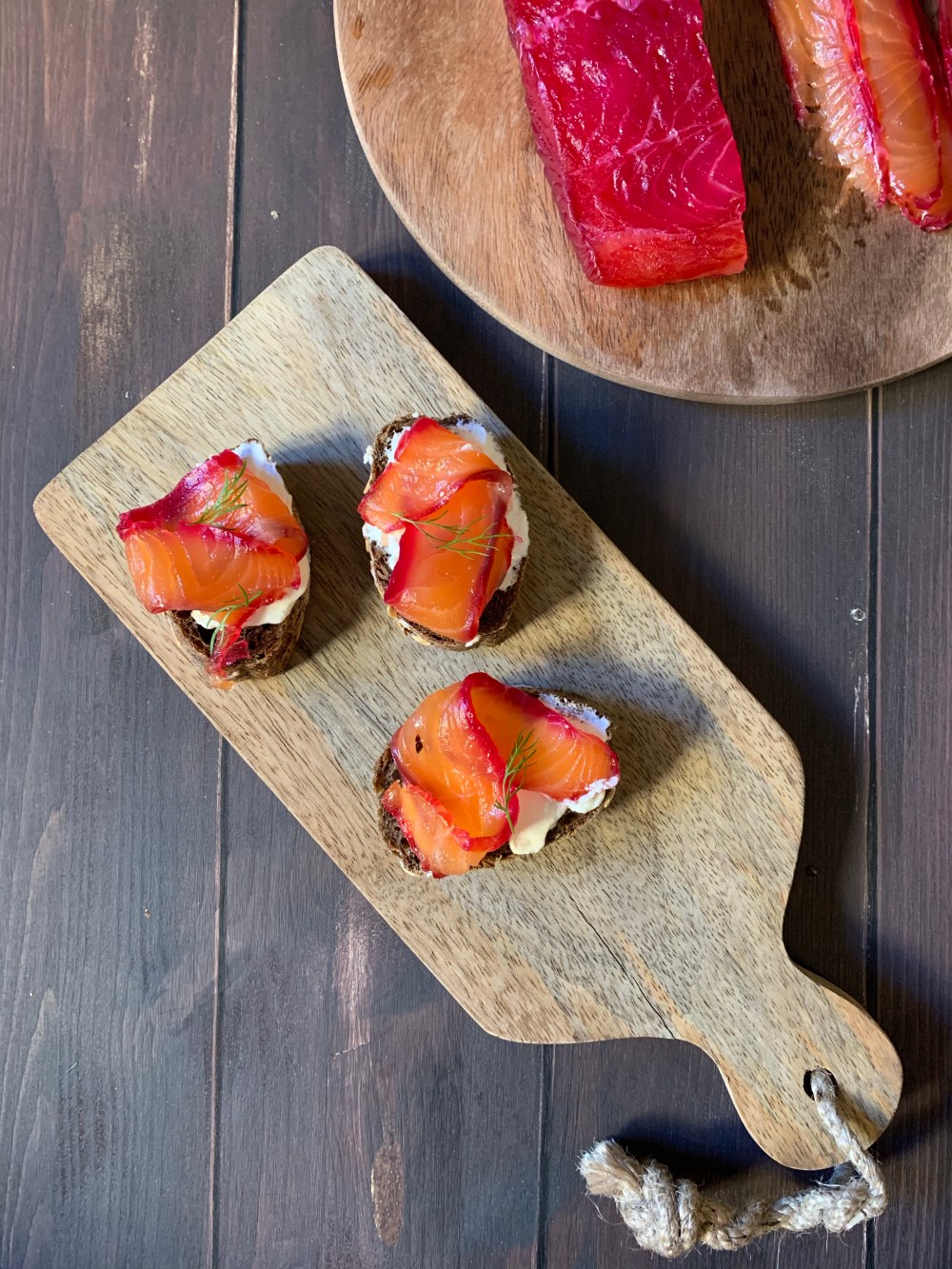 In Svezia questa marinatura si chiama Gravlax, non è altro che una miscela di zucchero, sale e le spezie che preferite. Vedrete che la consistenza del pesce cambierà e diventerà notevolmente più duro, rendendolo simile al salmone affumicato. L’utilizzo della barbabietola fa si che l’esterno del del salmone si colori di un rosso brillante, in contrasto con la polpa che rimarrà dell’arancione naturale del salmone.