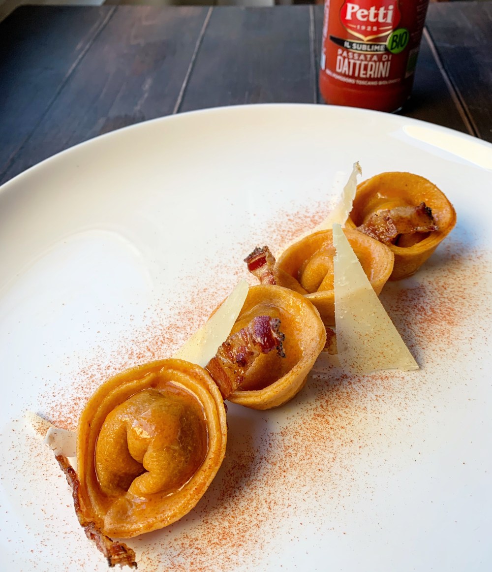 Lo so, è sempre un rischio presentare rivisitazioni di alcuni piatti, ma non ci posso fare niente, a volte è più forte di me. Questa volta è toccata all’amatriciana, uno dei miei piatti preferiti. Ho voluto fare dei tortelli che avessero il pomodoro, il guanciale e il pecorino all’interno..una delizia!