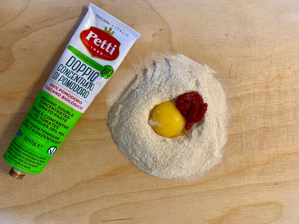 Impastate la farina, il tuorlo e il concentrato di pomodoro e aggiungete un po’ d’acqua alla volta. L’impasto non deve risultare troppo morbido e umido; lasciatelo riposare 1h avvolto nella pellicola in modo che sia più facile stenderlo.
