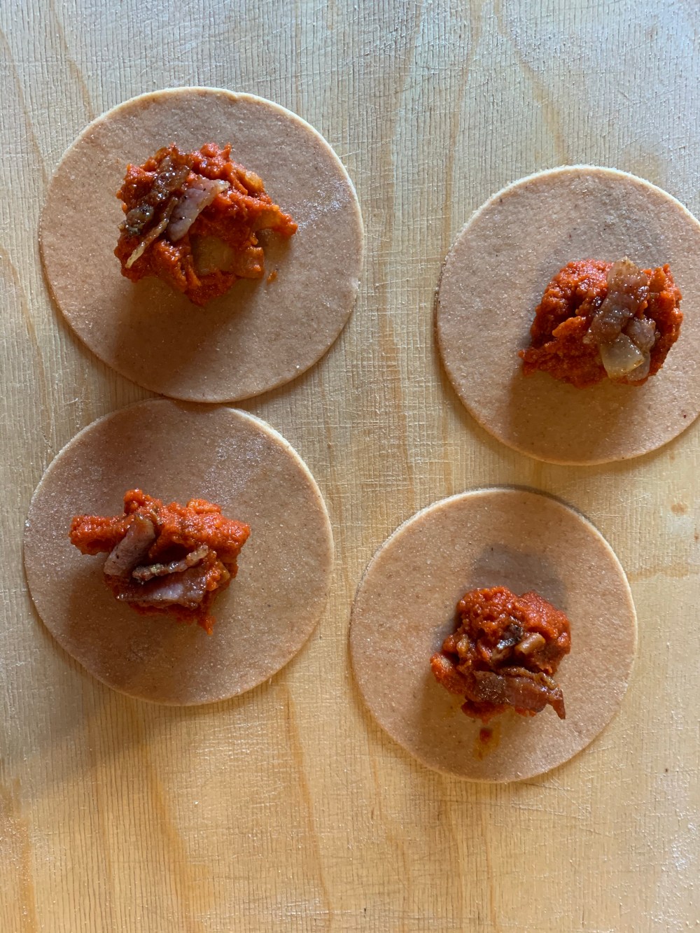 Stendete la pasta fino allo spessore desiderato, io ho voluto lasciarla più spessa per questo condimento ma potete stenderla più sottile se vi piace di più. Con un coppapasta da 10 cm ricavate dei cerchi, adagiate una noce di condimento e aggiungete altro guanciale soffritto per dare più croccantezza.