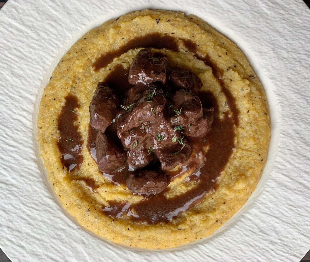 Impiattate con due generose cucchiaiate di polenta sul fondo del piatto, lo spezzatino e il suo sughetto e il timo fresco.