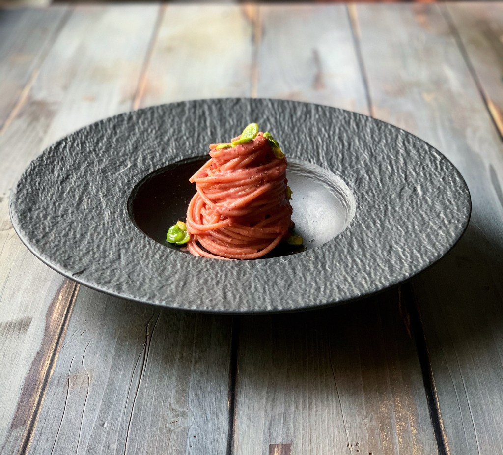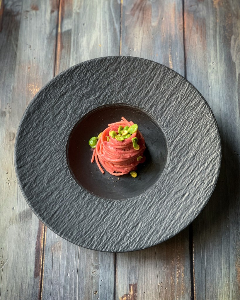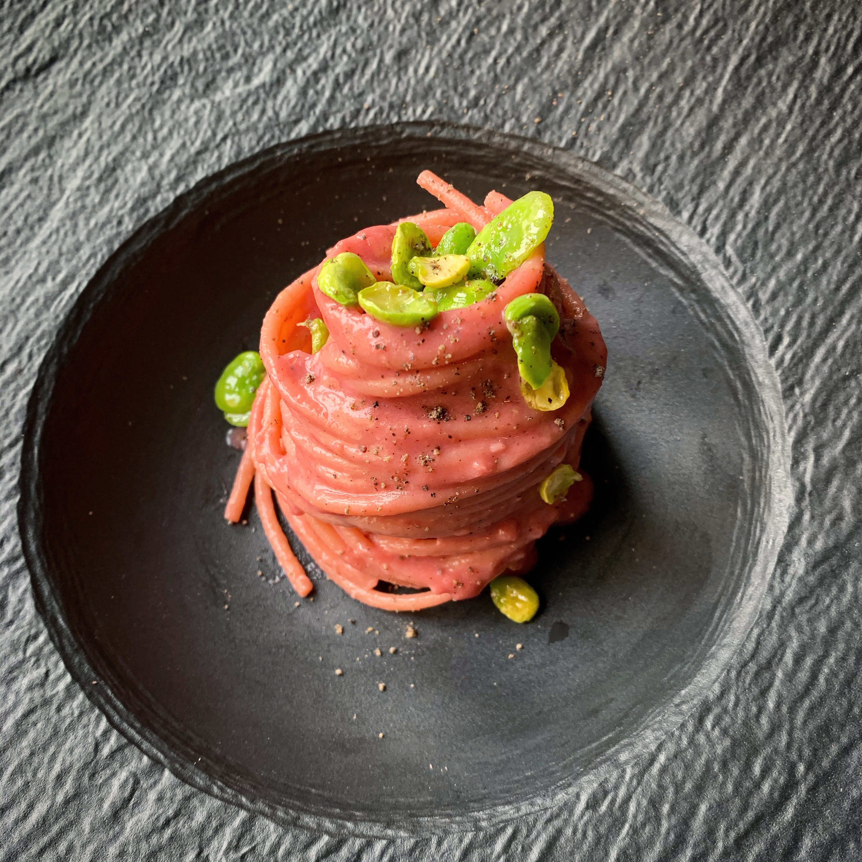 Quindi anche in questo caso, perché non “colorare” di rosa una semplice cacio e pepe? Magari anche con delle fave fresche saltate in padella con del limone.