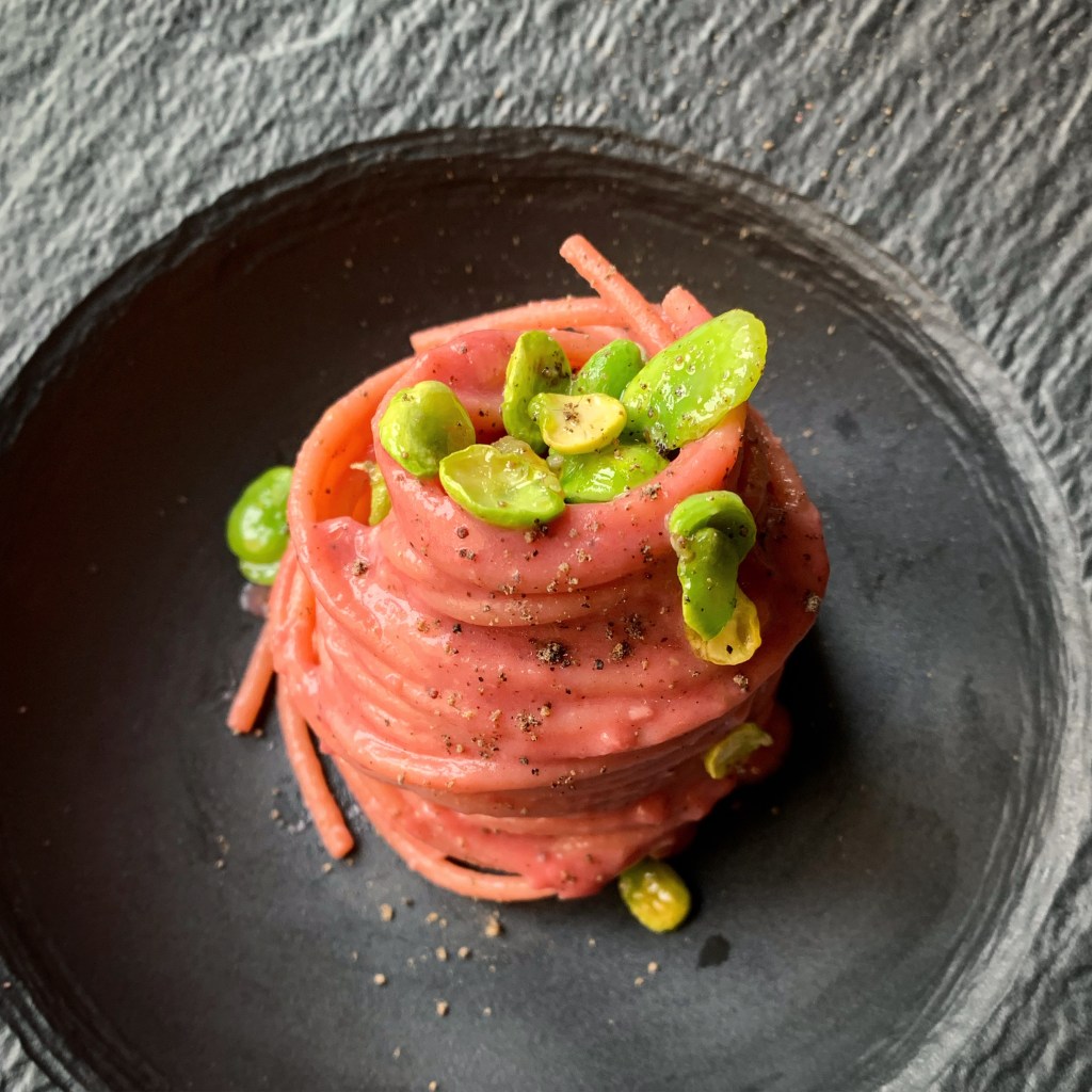In una pentola portate a bollore l’acqua, salate e versateci il succo di barbabietola. Aggiungete la pasta e lasciate cuocere. Scolate la pasta conservando un bicchiere di acqua di cottura che, in questo caso, sarà di un bel rosso vivo.
