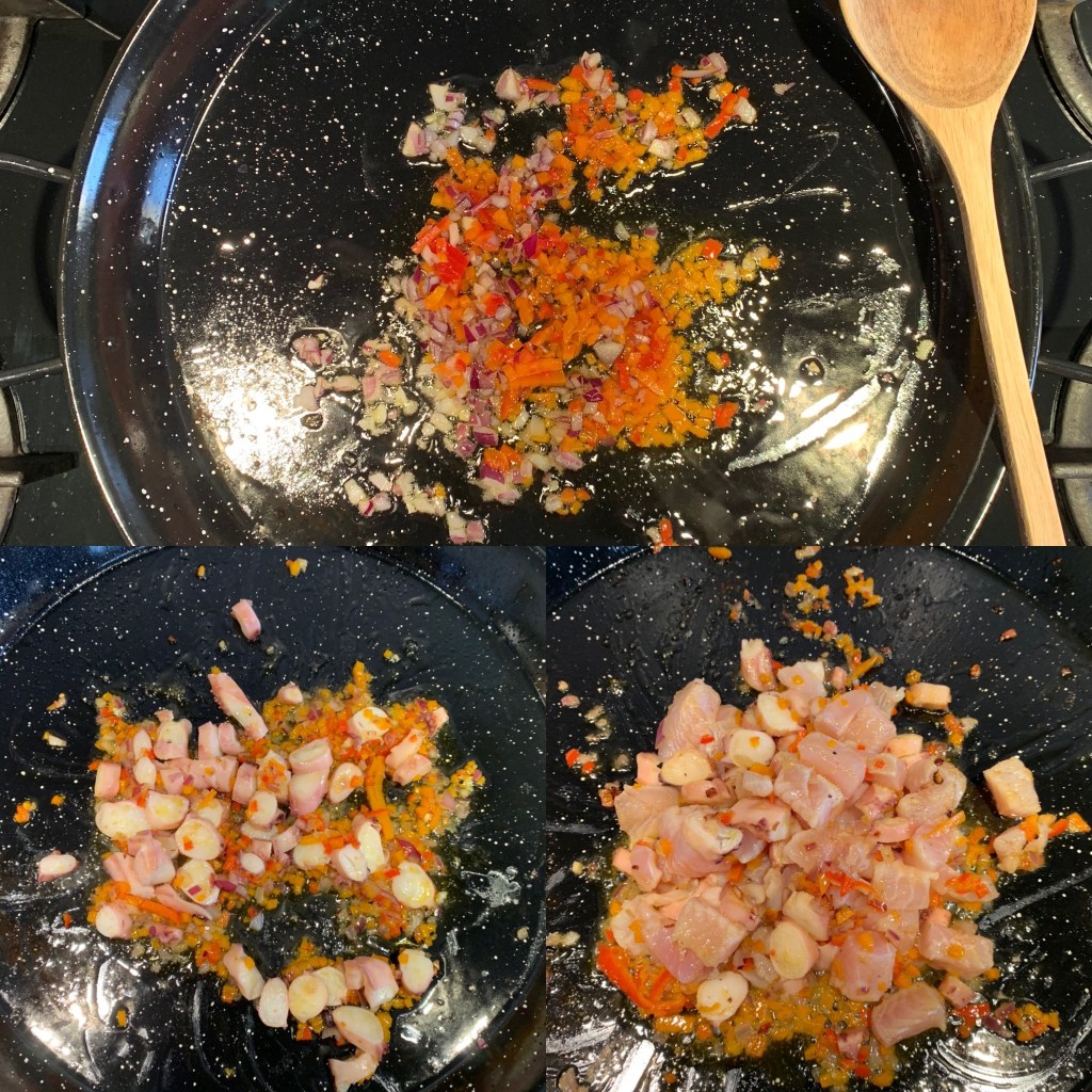 Fate soffriggere per qualche minuto in generoso olio evo. Aggiungete i pezzetti di polpo o calamaro e successivamente il pesce. Lasciate cuocere per poco più di 5 minuti a fiamma non troppo alta.