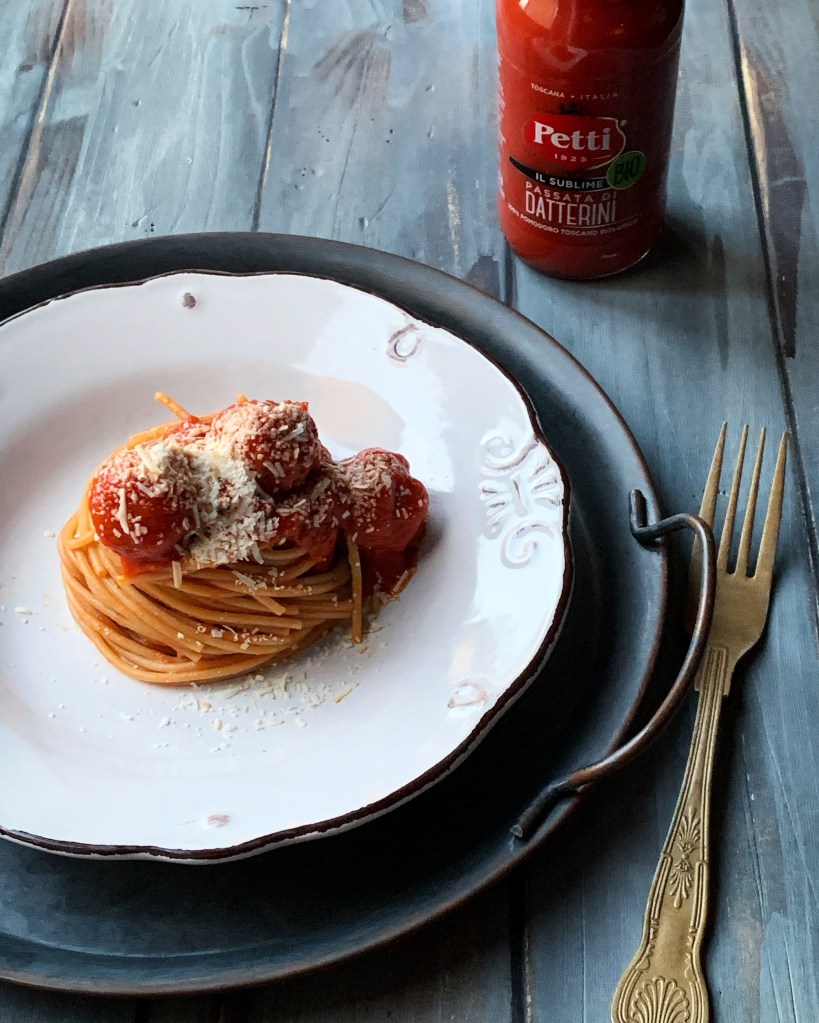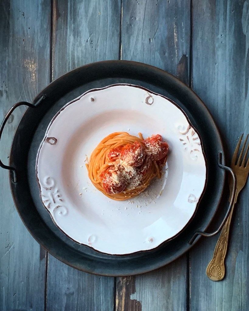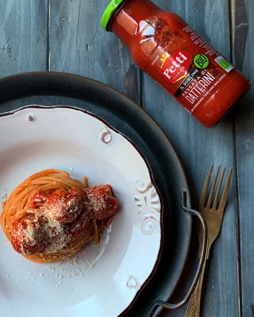 Gli spaghetti con le polpette sono un piatto simbolo della cucina italoamericana che trae origine dalla cucina popolare meridionale. Il piatto fu portato dagli immigrati italiani negli Stati Uniti e in particolare a New York, dove è diventato il simbolo della cucina italiana assieme alla pizza. Ogni volta che penso a questo piatto mi viene in mente la bellissima scena di Lilly e il vagabondo in cui si danno un bacio dividendo un piatto di spaghetti e polpette. Perfetto esempio di come la cucina sia sinonimo di amore.