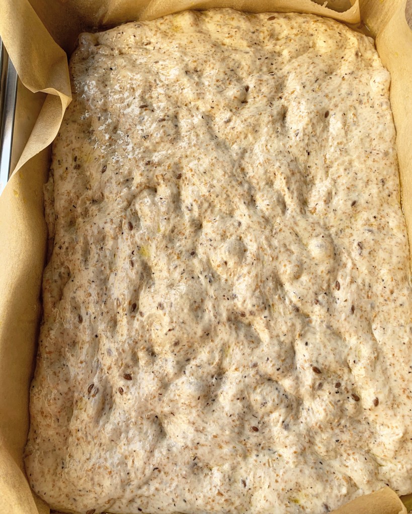 Trasferite l’impasto in un contenitore ermetico sufficiente a contenere almeno il doppio del quantitativo iniziale. Chiudete e lasciate lievitare a temperatura ambiente per 2/3 ore circa. A questo punto trasferite in frigo e lasciate maturare per 30h circa. Togliete dal frigo, fate acclimatare l’impasto per un’ora circa. Foderare una teglia con la carta forno e ungete con olio evo. Versate l’impasto e con i polpastrelli unti d’olio stendetela applicando pressione dal centro verso l’esterno; Coprite con la pellicola e lasciate lievitare per due ore circa.