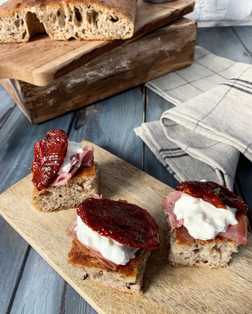 Iniziate con il polish; nell’impastatrice mescolate velocemente con una forchetta la farina, l’acqua e il lievito, coprite con la pellicola e lasciate fermentare per un paio d’ore.