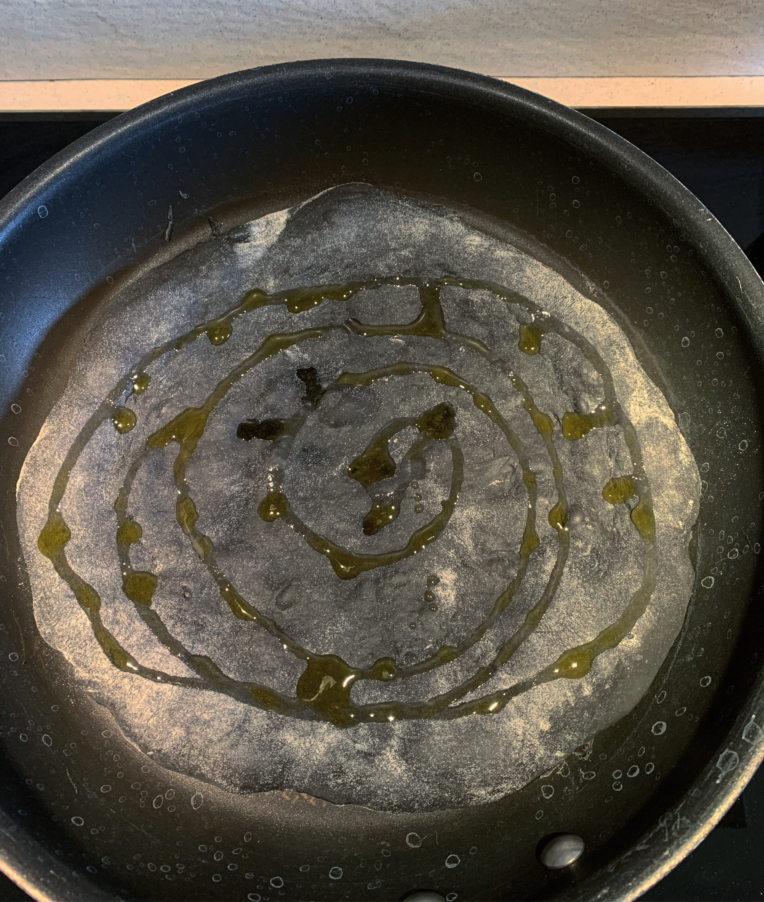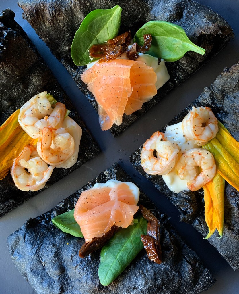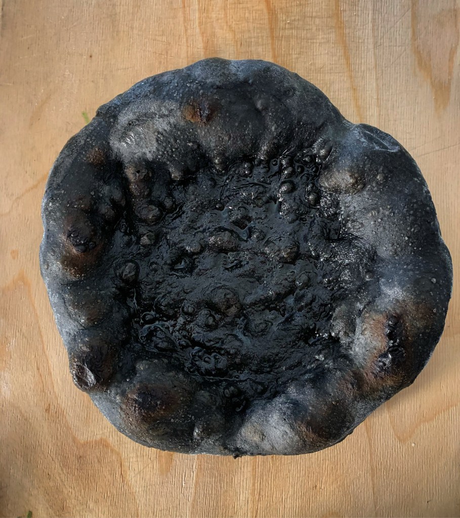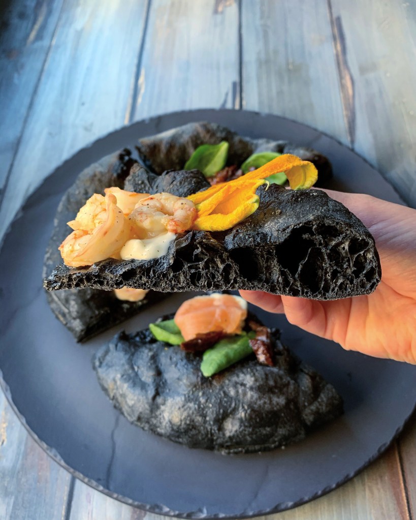 In una planetaria versate la farina, il malto, il lievito e il sale. Versate il nero di seppia e l’acqua a filo e azionate l’impastatrice a velocità bassa. Una volta versata tutta l’acqua aumentate la velocità dell’impastatrice e proseguite fino a quando non sarà incordato e quindi tutto l’impasto sarà attaccato al gancio, staccandosi dalle pareti. Trasferite il composto in un contenitore di plastica con chiusura ermetica e lasciate lievitare per 2 ore a temperatura ambiente, poi in frigo tutta la notte. Il giorno successivo togliete dal frigo e fate acclimatare per un’ora circa, versate poi su una spianatoia ben infarinata, dividere a metà e formate due palle di impasto senza toccarle troppo, spolverizzate la superficie e lasciate lievitare per 2 ore coperta da un canovaccio o pellicola. Con i polpastrelli schiacciare l’impasto senza toccare il bordo. Trasferite su una padella antiaderente già calda e lasciate cuocere per 2/3 minuti circa. Cospargete la superficie con un filo d’olio. Trasferite in forno sul piano più alto e con il grill acceso ultimamente la cottura per altri 3 minuti circa. (Ovviamente lo sportello resterà aperto per lasciare il manico fuori)