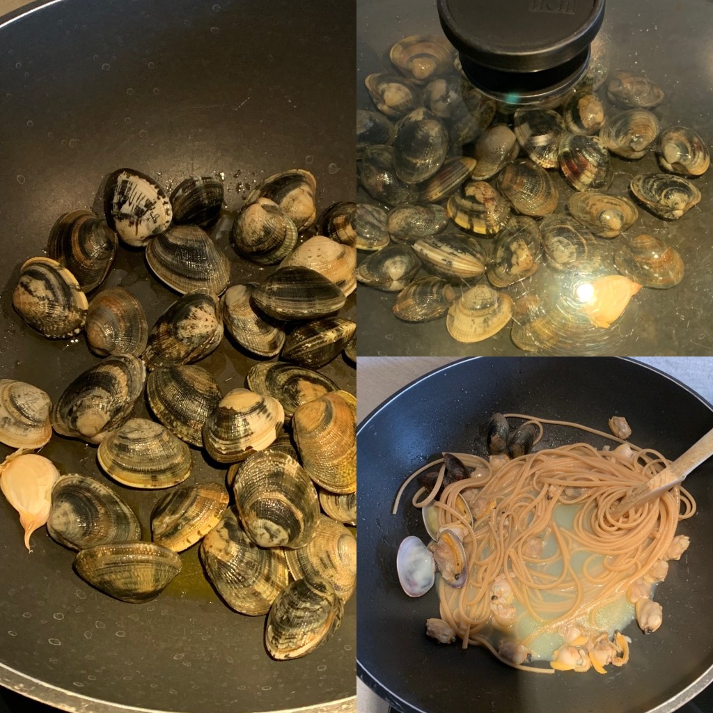 Lessate pasta in abbondante acqua salata, intanto in una padella antiaderente fate soffriggere uno spicchio d’aglio in camicia. Aggiungete le vongole, coprite con un coperchio e lasciatele cuocere per 7 minuti circa. Vedrete che si apriranno naturalmente facendo fuoriuscire il loro sughetto saporito. Scolate la pasta un minuto prima della cottura. Personalmente non amo mangiare la pasta con vongole o cozze che abbiano il guscio, non mi godo il piatto e non mi piace inzaccherarmi le mani. Quindi con un cucchiaino stacco il mollusco dal guscio, lasciandone giusto 2/3 per guarnizione. Se voi preferite, lasciatele pure così. Eliminate lo spicchio d’aglio e versate la pasta nella padella delle vongole e mescolando con un cucchiaio di legno e ultimate la cottura per un minuto. Permetterete la fuoriuscita dell’amido formando una cremina deliziosa che non richiederà aggiunta di ulteriori grassi. Impiattate e spolverizzate con prezzemolo fresco.