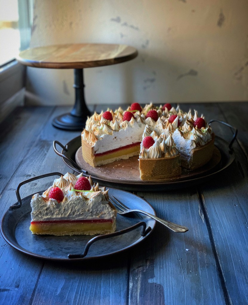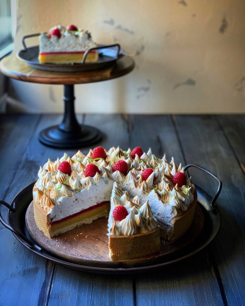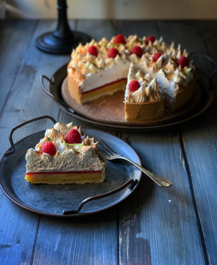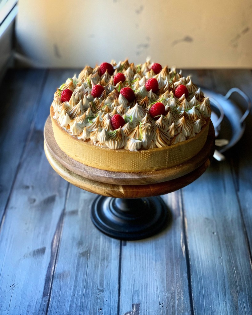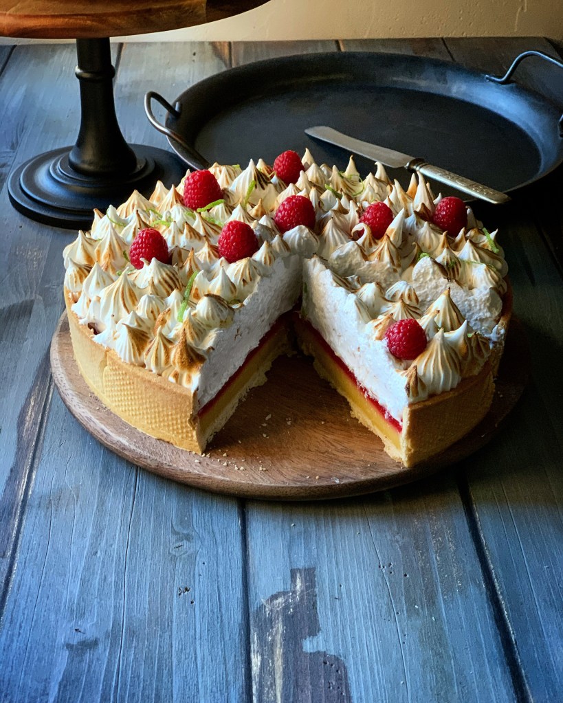 Con un cannello da cucina bruciacchiate i ciuffetti di meringa, sarà sufficiente passarlo per pochissimi secondi. Decorate con zest di lime e lamponi freschi, riponete in frigo per almeno 2h prima di servirla.