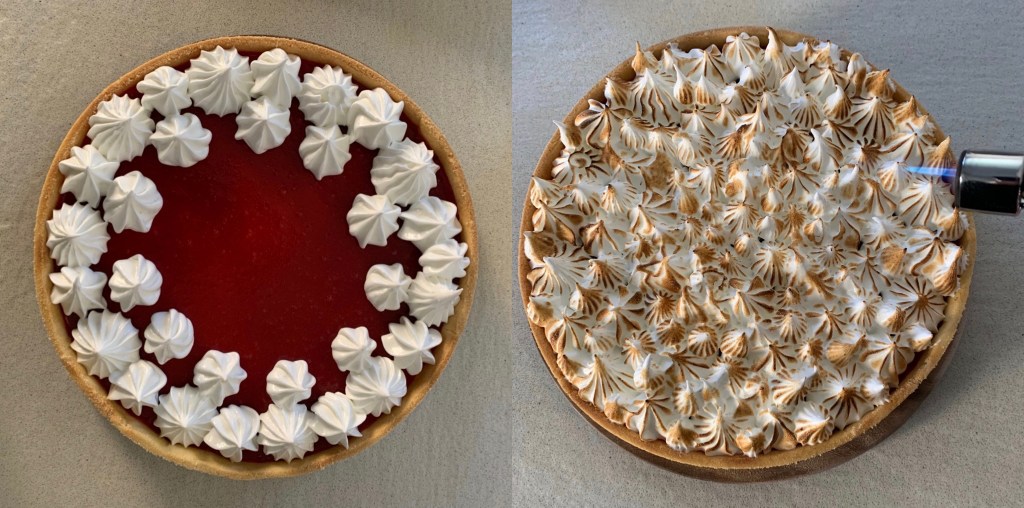 1. Ciao! Nessun disturbo, anzi. Potresti essere più chiara nella richiesta? Perché la meringa, essendo quella italiana, si pastorizza con lo sciroppo di zucchero bollente, è quella la sua unica cottura e poi per dare l’aspetto caramellato la passi con cannello. Per la frolla che tipo di indicazioni ti occorrono?