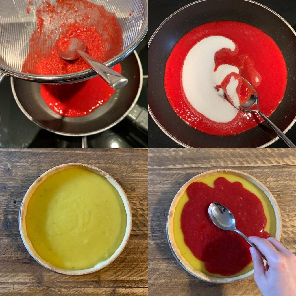Versate il lime curd nel guscio di frolla, mettete in frigo per 1h circa. Prelevate dal frigo e versate la gelatina di lamponi, distribuitela uniformemente e ponetela in frigo per tutta la notte.