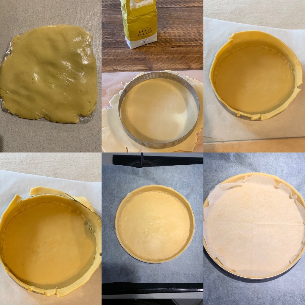 Tiratela fuori dal frigo, lasciatela 10 minuti a temperatura ambiente e prendetene 2/3. Stendetela con un mattarello fino ad uno spessore di 5 millimetri circa, con un anello traforato o con il bordo della tortiera ricavate un disco. Adagiatelo al centro della tortiera. Stendete ora la restante parte dell’impasto in modo da ottenere una fettuccia sempre dello spessore di 5 millimetri e lunga abbastanza da coprire la circonferenza della tortiera. Fatelo aderire bene al disco precedente, rifinite il bordo con il dorso della lama di un coltello. Trasferite in frigo e lasciatelo per 30 minuti circa. Preriscaldate il forno a 175º in modalità ventilata, tirate fuori dal frigo la tortiera, punzecchiate la base con una forchetta, adagiate un disco di carta forno e coprite con dei legumi o del riso per evitare che gonfi in cottura; trasferite in forno e cuocere per 15/20 minuti.