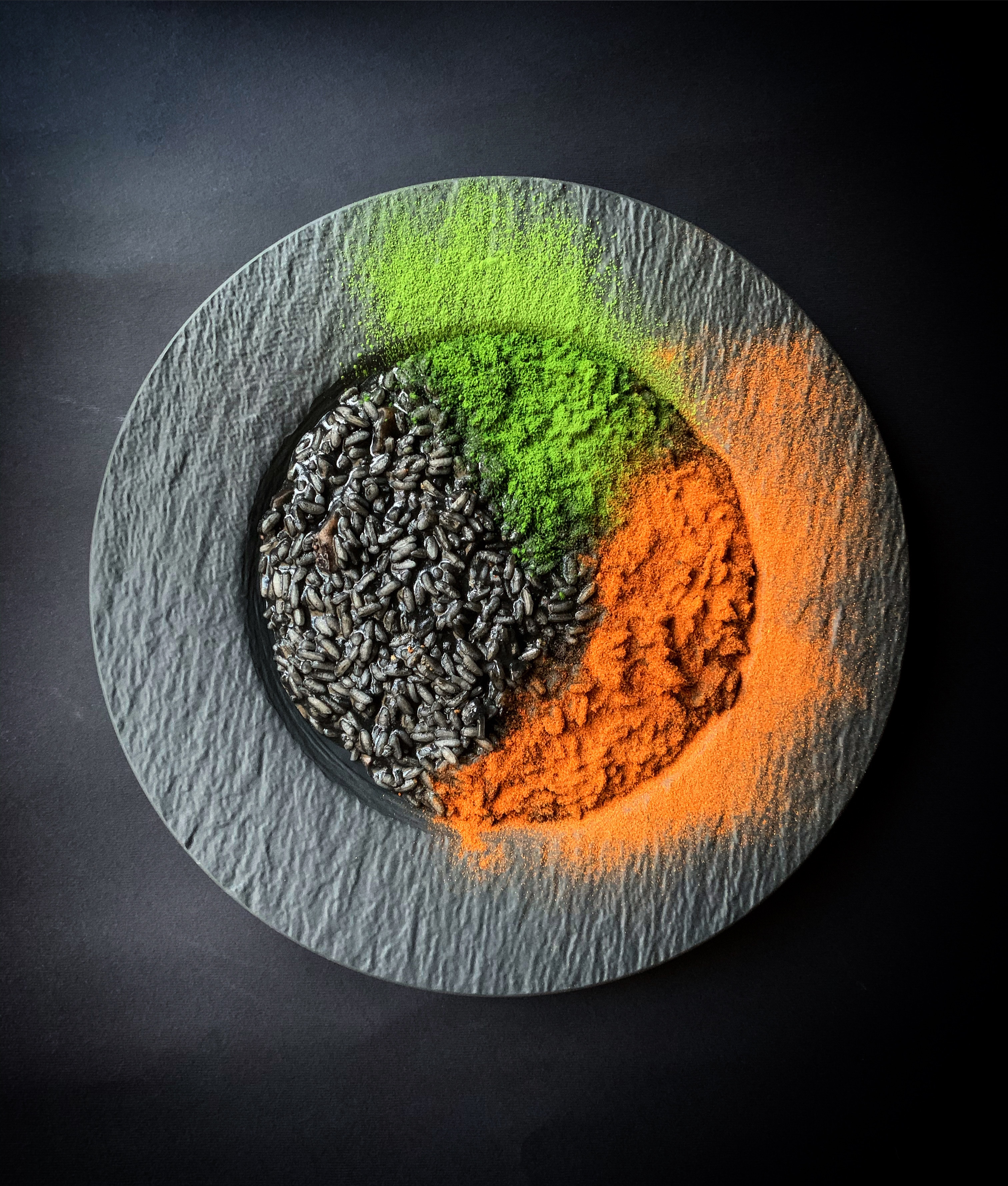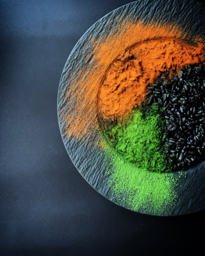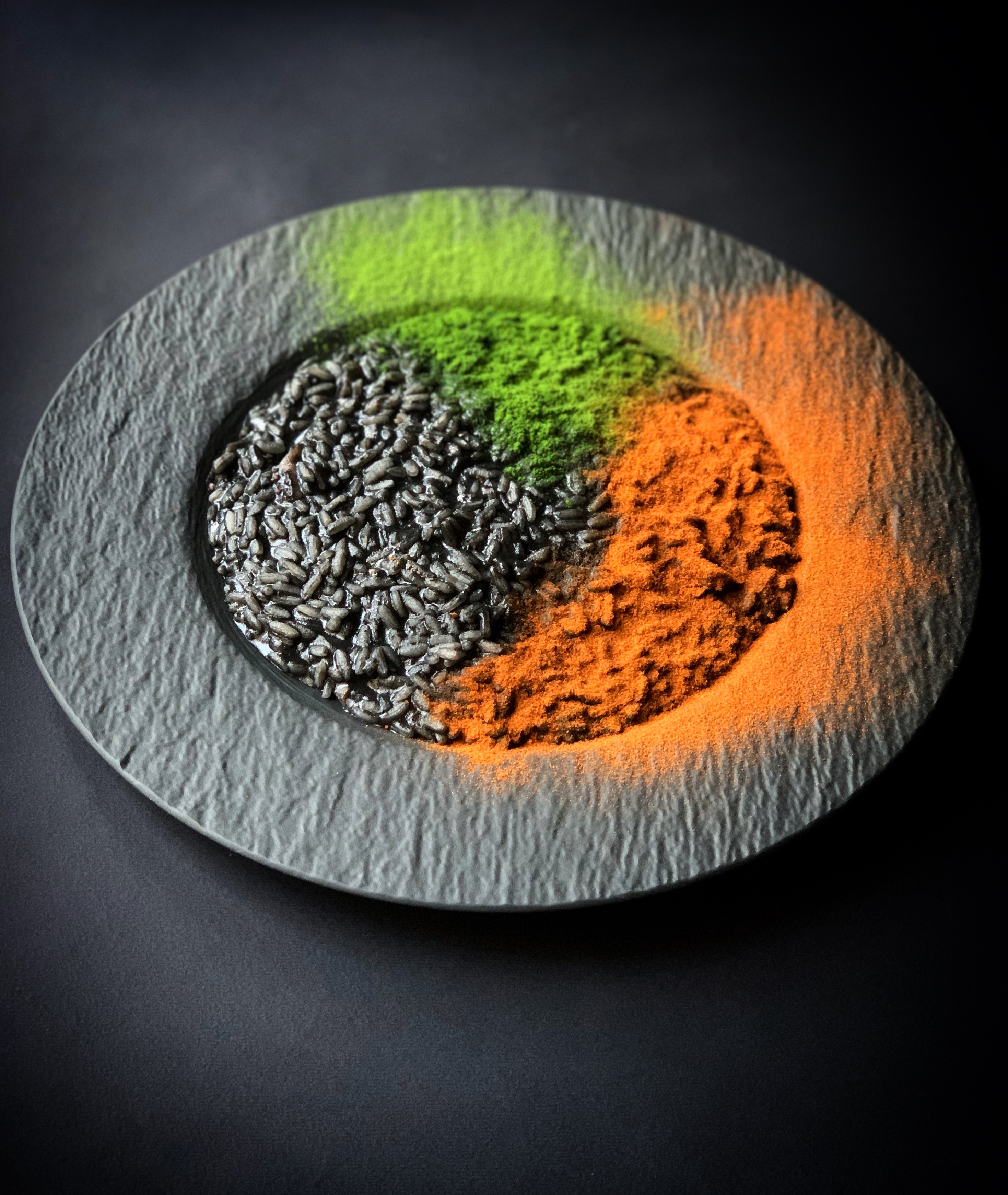 Per esaltare il semplice risotto al nero di seppia ho utilizzato la polvere di pomodoro e la polvere di sedano, una combo perfetta.