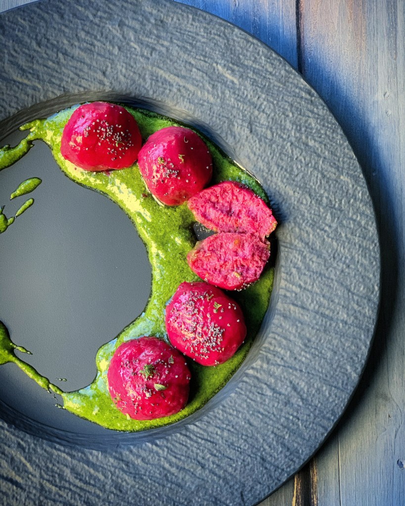 In questa ricetta unisco due cose che adoro: gli gnocchi e le barbabietole. Inutile dirvi che il risultato l’ho adorato; restano morbidissimi e si sciolgono in bocca. Essendo abbastanza dolciastri, consiglio di condirli con ingredienti sapidi come pancetta/guanciale o formaggi stagionati. Io ad esempio ho optato per un pesto fatto con il pecorino e non col grana e semi di papavero.
