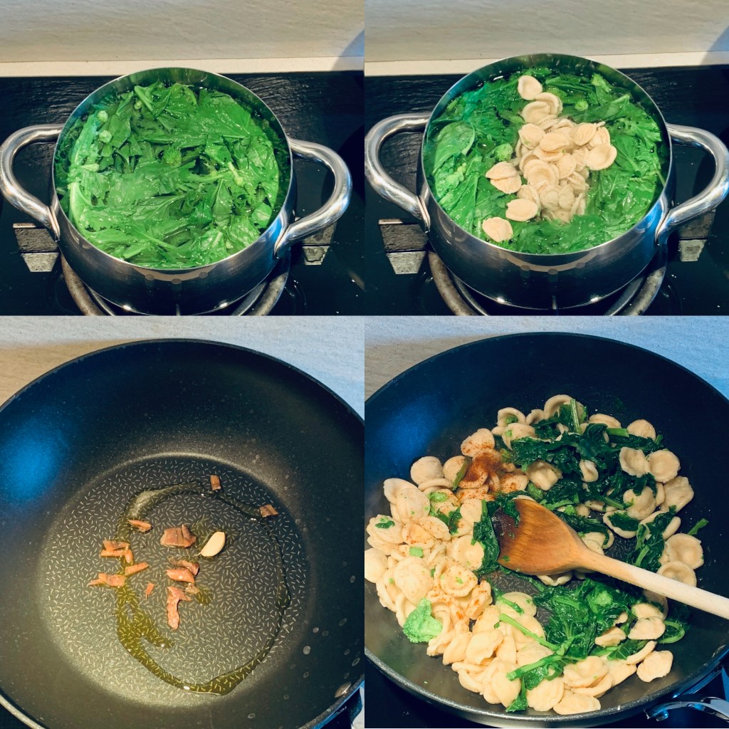 In una padella antiaderente fate soffriggere un filo d’olio evo 2 acciughe sminuzzate e uno spicchio d’aglio. Aggiungete le orecchiette con le cime di rapa, il peperoncino e fatele saltare per fare insapore bene.