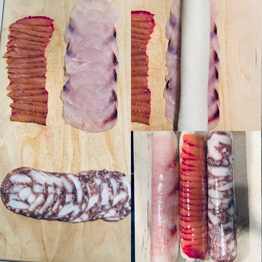 Riprendete i rotoli precedenti e togliete la pellicola (non buttatela!) rivestite una parte con le fettine di pesce precedentemente sovrapposte ricoprendo tutto il cilindro. Riavvolgete nella pellicola e lasciate in frigo fino per almeno altre 2 ore. Al momento di servirle tagliate a rondelle di uguale misura utilizzando un coltello non seghettato.