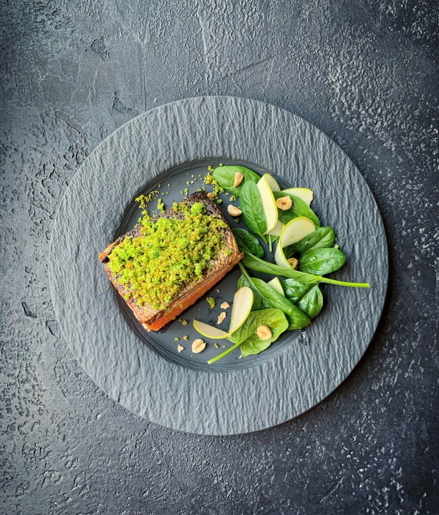 Impiattate il salmone e ricoprire la superficie con il crumble di prezzemolo e affiancate l’insalata alla mela verde.