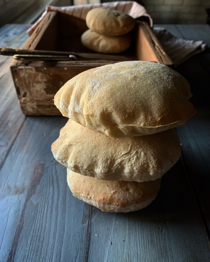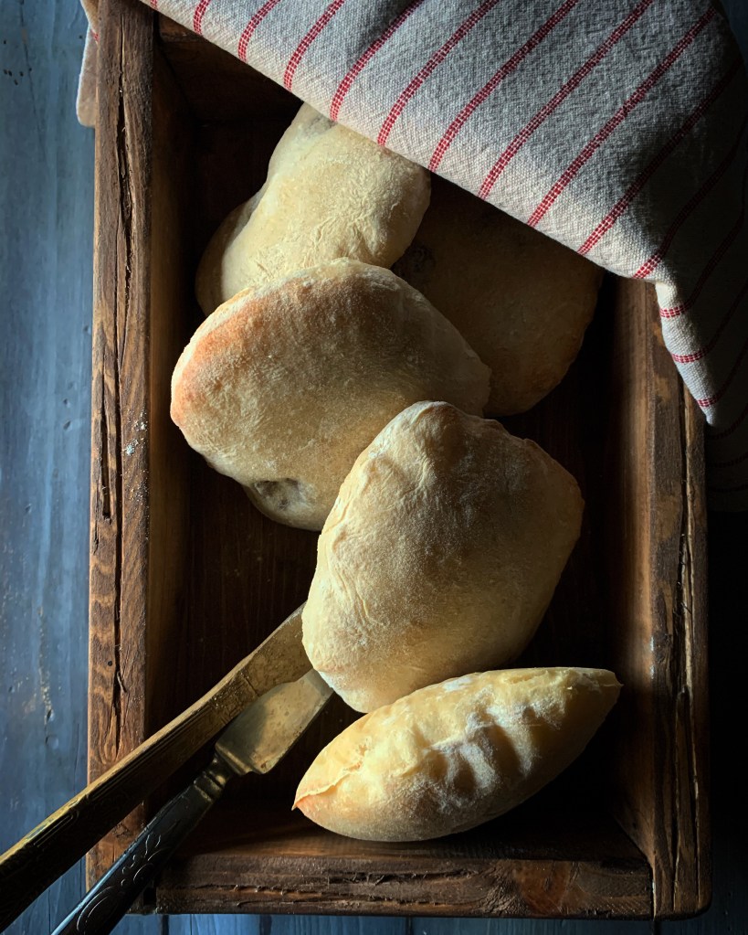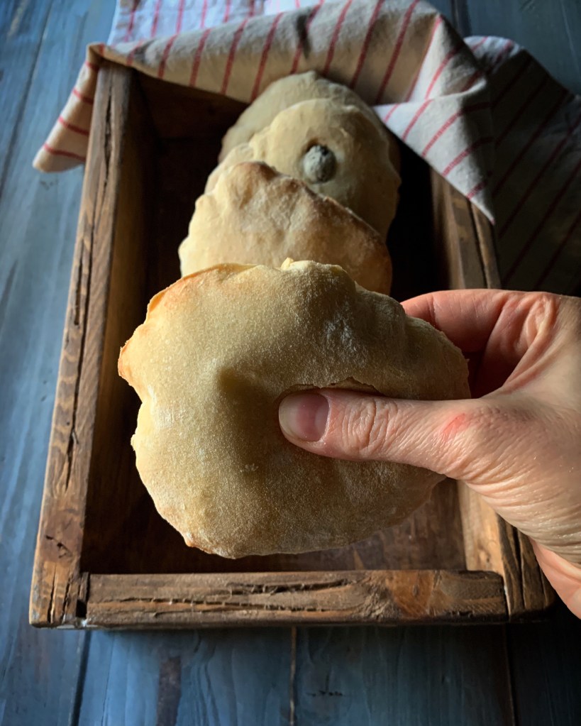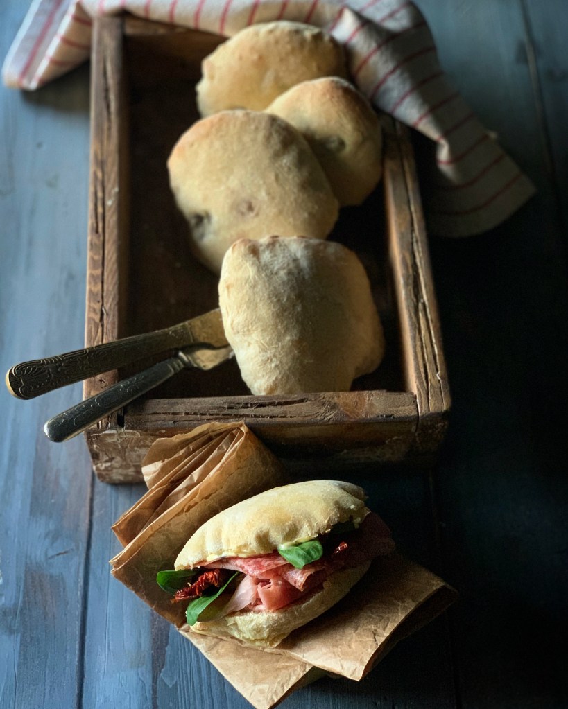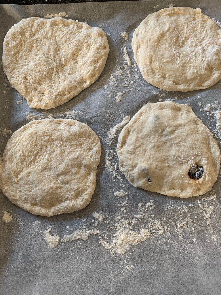 Coprite con la pellicola e lasciate lievitare per 6 ore circa. Dividete l’impasto in pezzi da 90 gr circa, se volete aggiungete 3/4 olive nere denocciolate per panino e lavorate fino ad ottenere delle palline. Infarinate una teglia rivestita da carta forno e schiacciate con i polpastrelli ottenendo dei dischi. Dovranno essere più sottili ai bordi e più paffuti al centro.