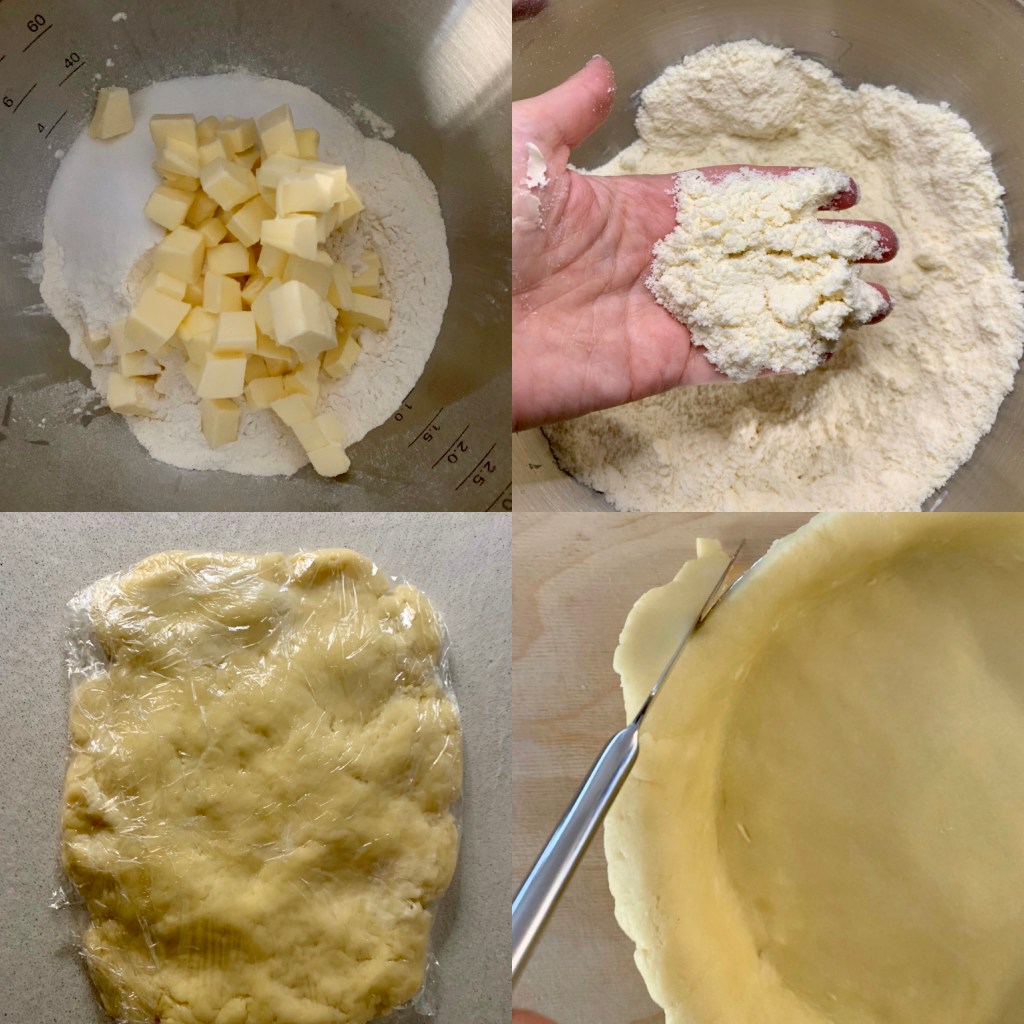 In una planetaria lavorate con un gancio e foglia la farina lo zucchero e il burro freddo tagliato a pezzetti. Dovete ottenere una sabbia. A questo punto aggiungete l’acqua fredda fino a formare un impasto abbastanza compatto. Appiattitelo, avvolgetelo nella pellicola e lasciate in frigo per un paio d’ore.