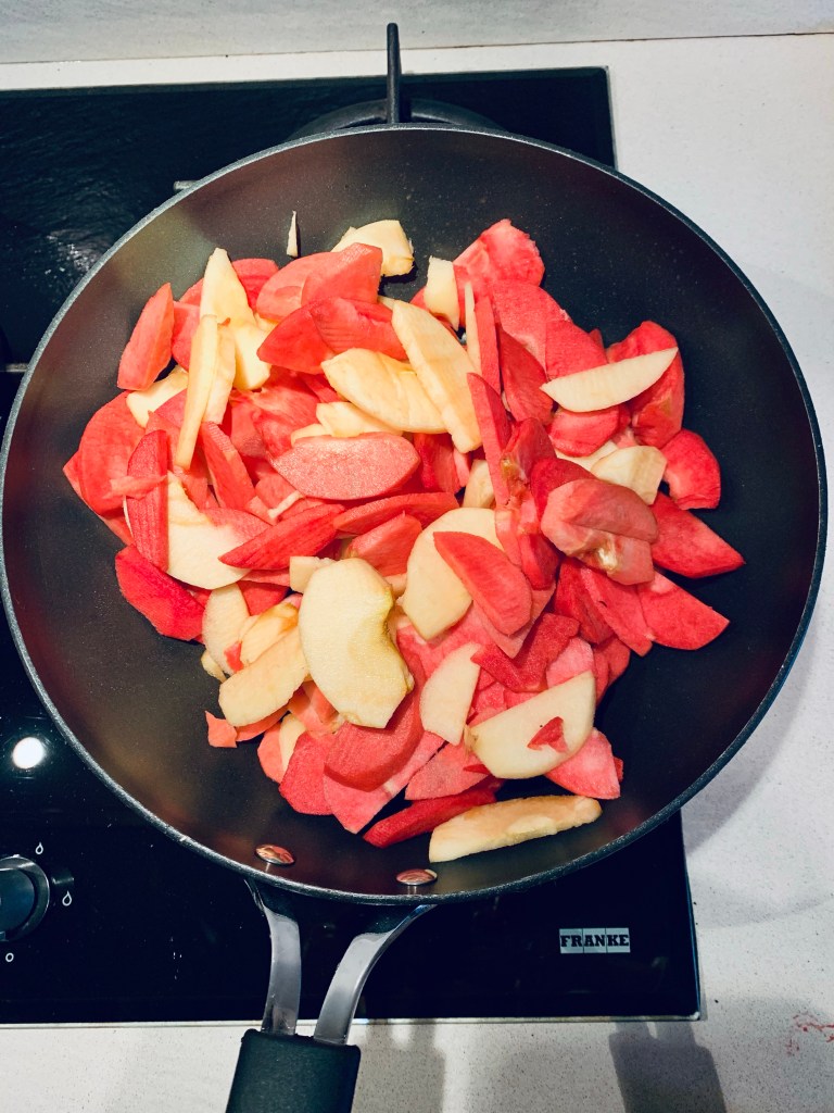 Intanto sbucciate le mele e provatele del torsolo. Tagliatele a fettine di mezzo centimetro e ponetele in una padella antiaderente assieme al burro e lasciatele cuocere per 10 minuti circa girando di tanto in tanto. Lasciatele raffreddare e poi aggiungete il mix di amido/zucchero/cannella; mescolate e tenete da parte.