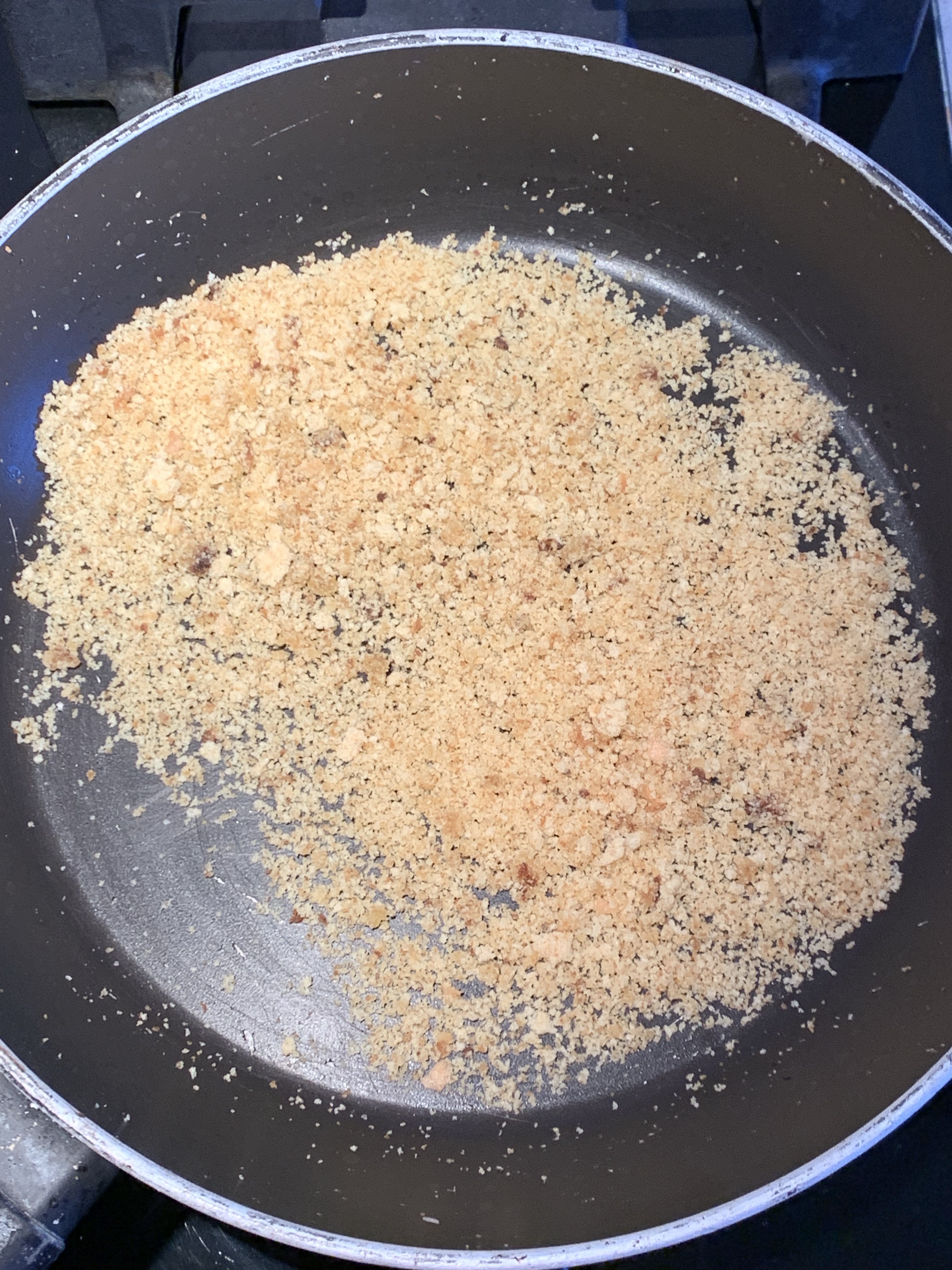 Frullate la fetta di pane o pancarrè fino ad ottenere delle briciole di mollica. In un padellino antiaderente fate soffriggere un un’acciuga sminuzzata in un filo d’olio. Quando si sarà sciolta aggiungete la mollica e fatela tostare.